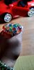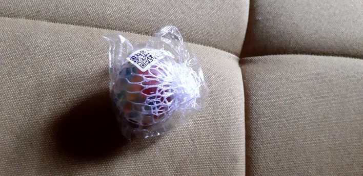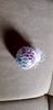 These balls are clear with colorful balls inside, have a 6.5cm diameter, and have a white mesh around it.