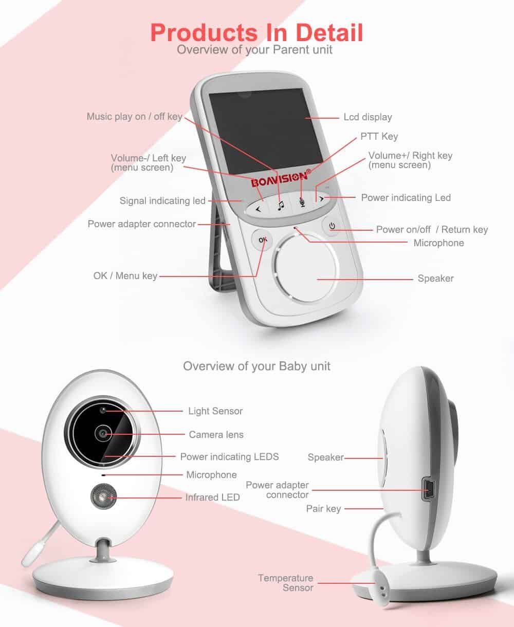– This video baby monitor is equipped a 2.4 inch LCD screen and connected to the baby camera via enhanced 2.4GHz wireless technology, clearly show our babies without WiFi interference