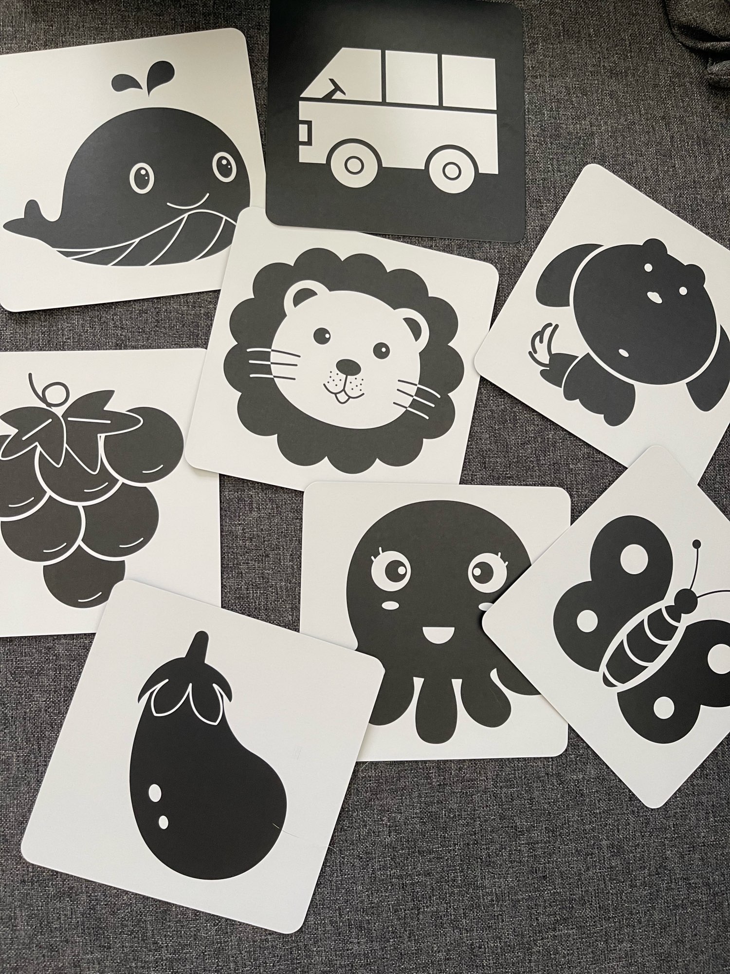 In their first 3 months, babies cannot see all colours. Research suggests that at this age, they prefer black and white images. Our high contrast baby flashcards are ideal for developing and stimulating their visual senses.