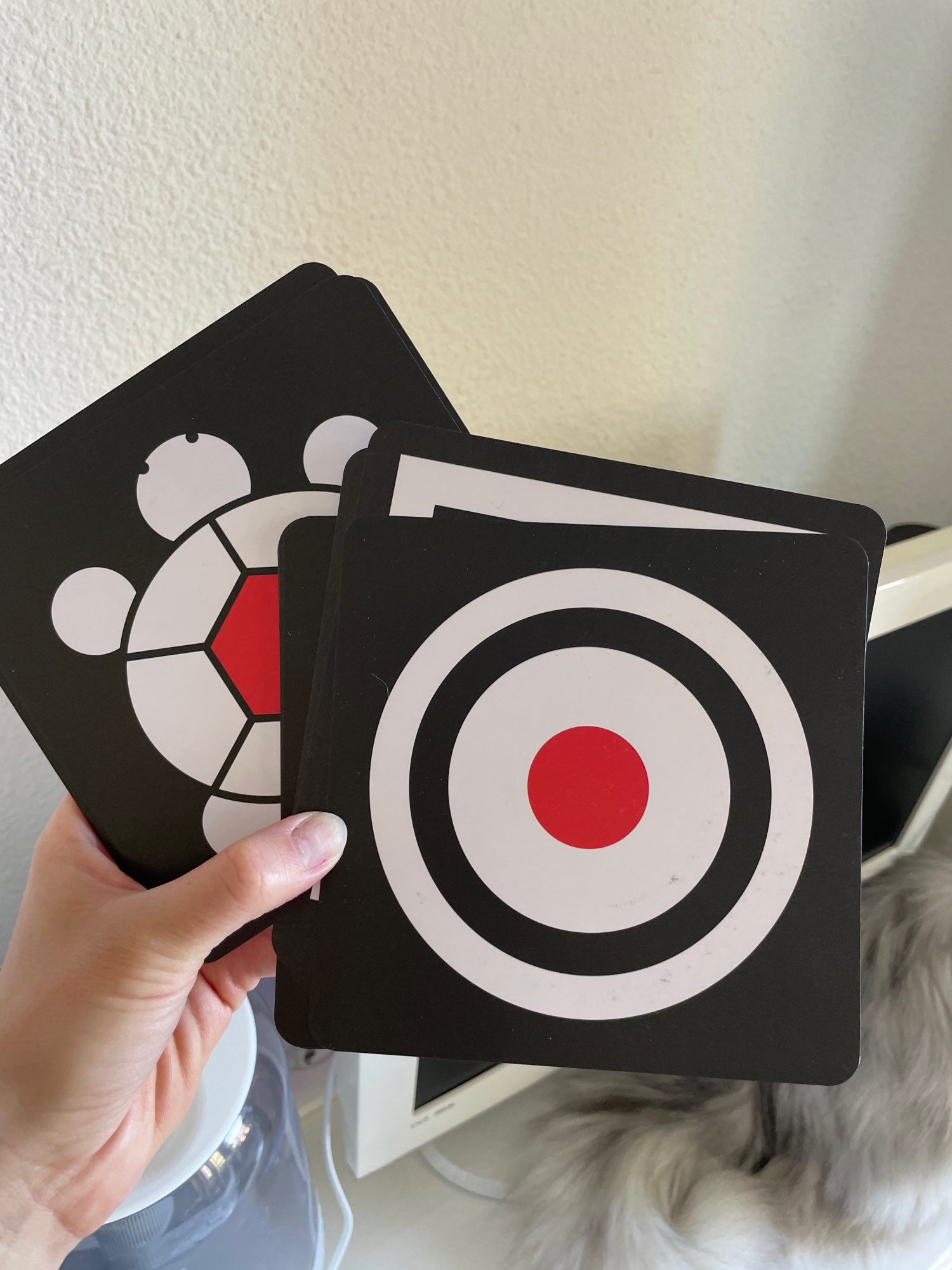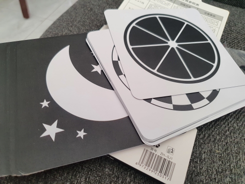 Handhold the card about 30-40 cm away from baby and move slowly to attract the eyes of baby and after baby gaze the card for 5-6 seconds then change to the next card. We recommend using 5-10 cards at a time.