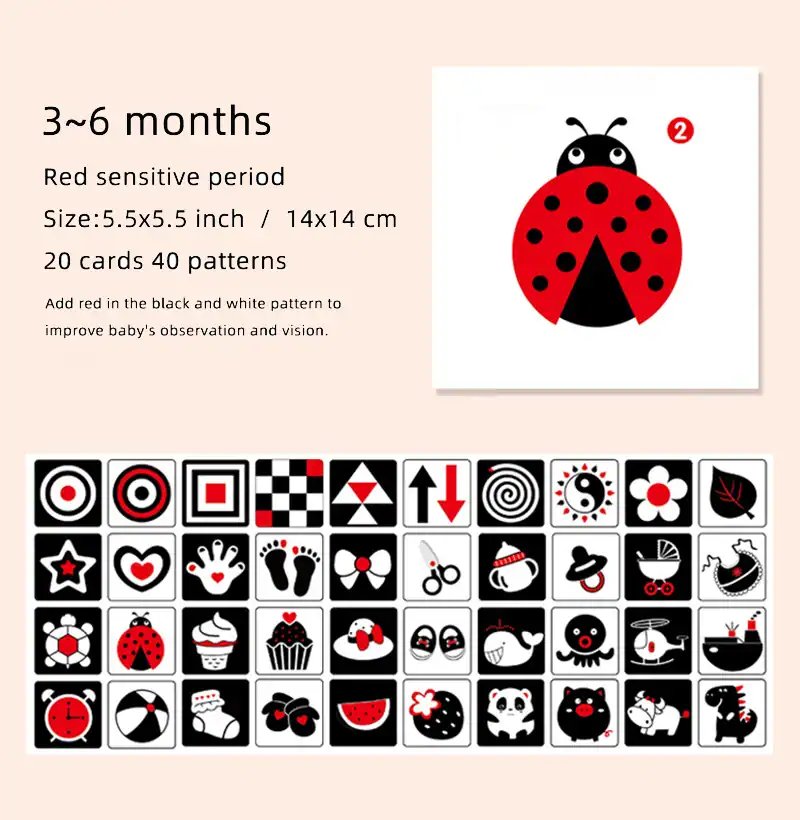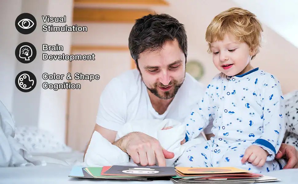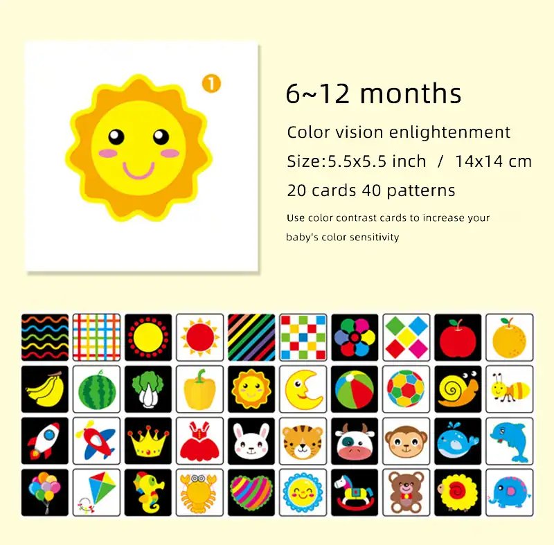 Between the ages of 0 and 3 is the golden age for baby brain development. Activate the baby’s visual nervous system through black and white card and color card Promoting whole brain development and matching light and shade, Perception of graphics. Improve observation, curiosity, and the ability to explore .It’s great for your baby’s vision development and brain development!