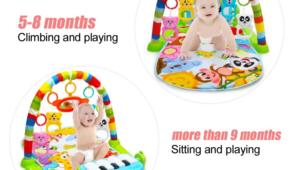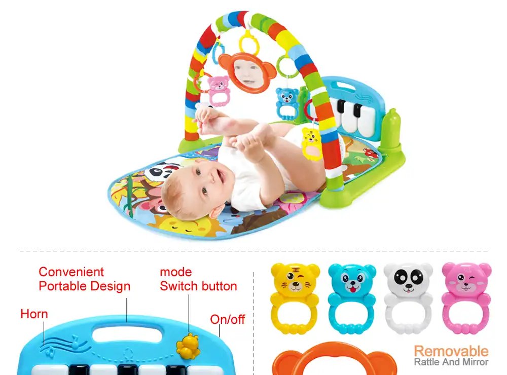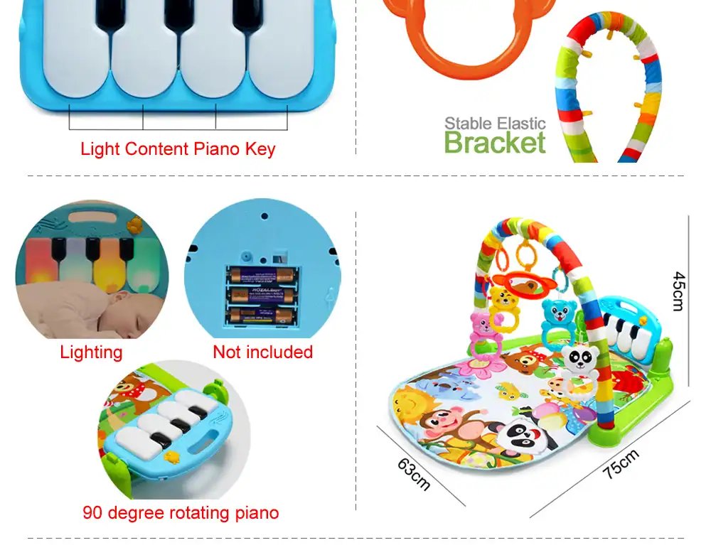 Ultimate Comfort And Safety Our baby play mat gym provides the joy and pleasure for your babies! Equipped with multifunctional piano, this piano play mat can increase the enjoyment during baby’s activity. Baby can sit, lie down and play on the pad, or take along. And the activity play mat comes with 4 cute rattle pendants to attract your infant’s attention.
