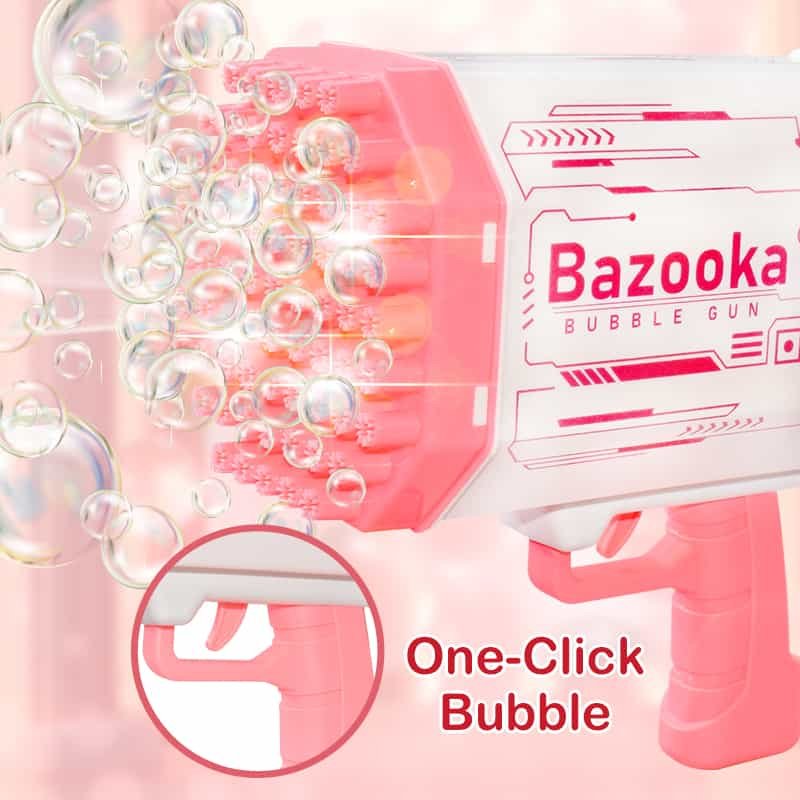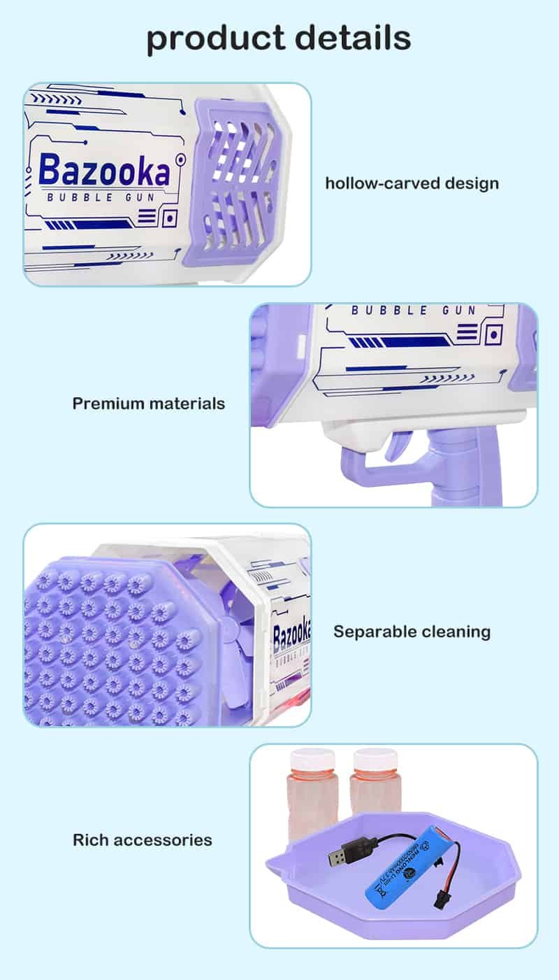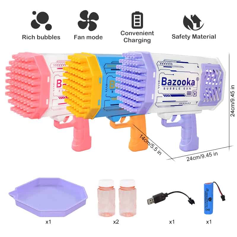 1. Powered by lithium battery: Interesting leaf blower that produces a stream of bubbles. With realistic design and fresh colors, this toy bubble blower is what you need. tap the bubble liquid and pull the trigger, a lot of bubbles will be ejected!