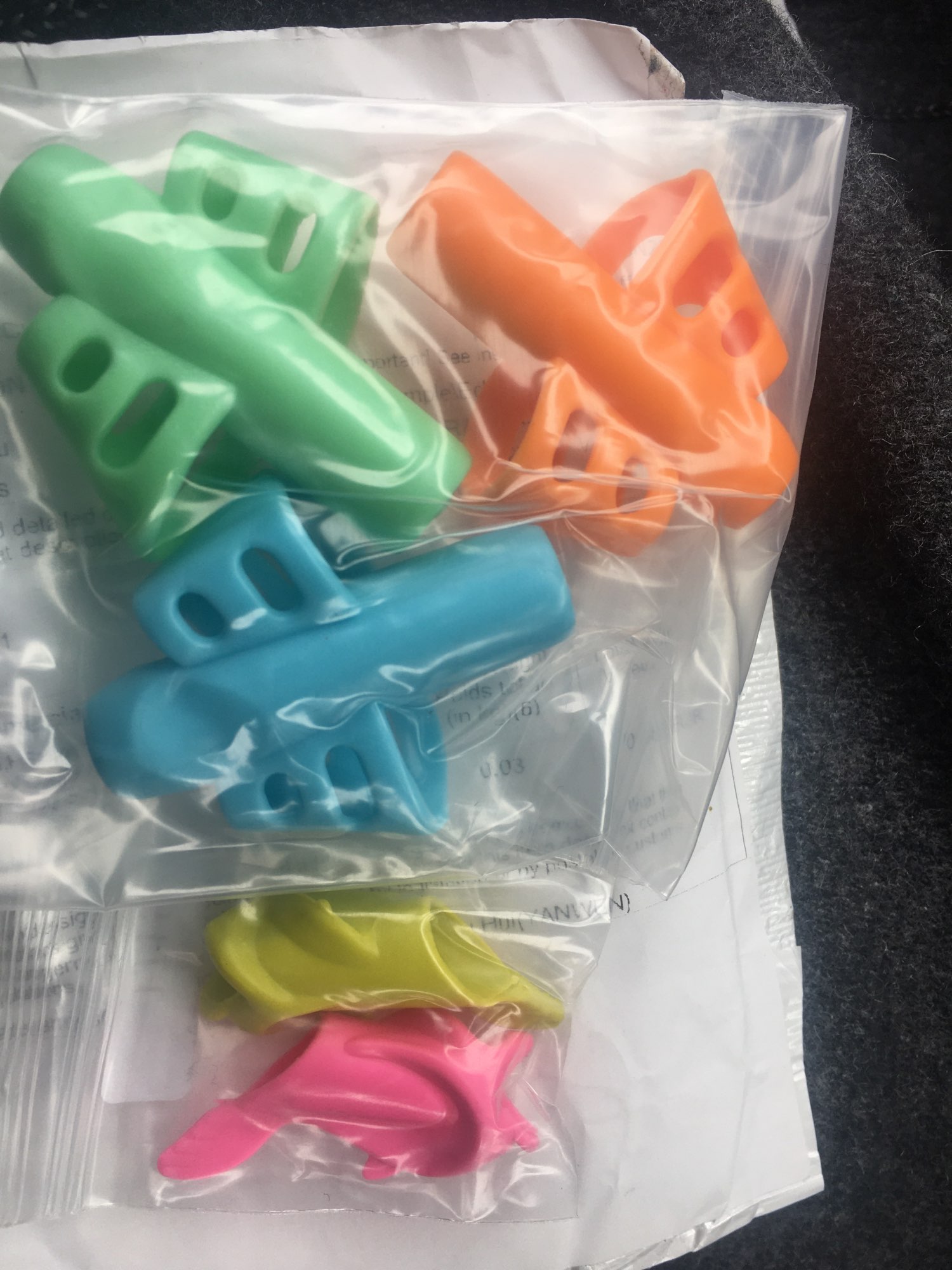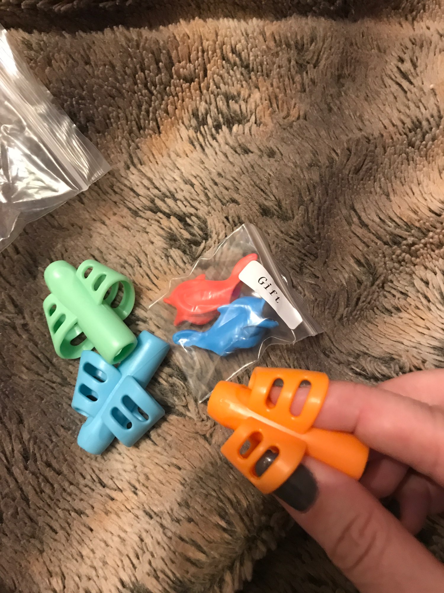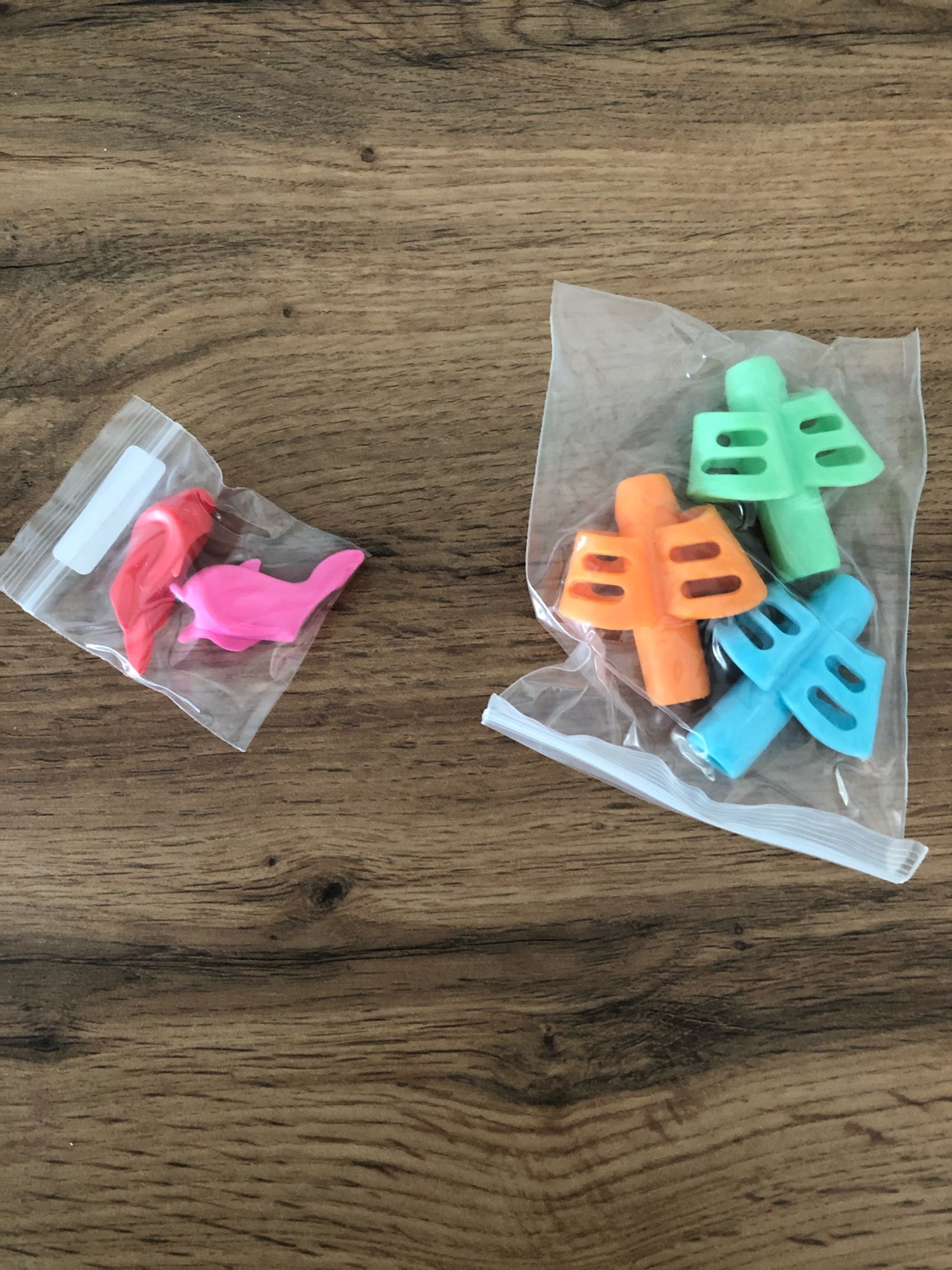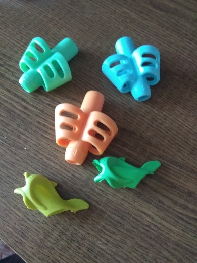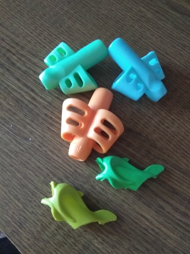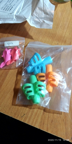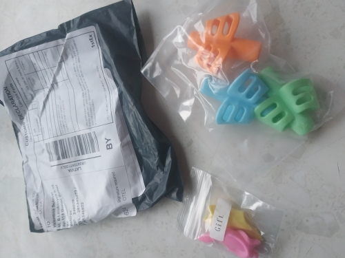 The goods are excellent. I ordered 2 sets. Good fixation of fingers, with a column for the middle finger, on the back. Came each with a gift in the form of two fish. I thought, the decoration, but it turned out that the comb of the fish also allows you to properly fix the fingers on the pencil. Very cool!!! Many thanks to the store. I recommend to everyone who has children learning to write.