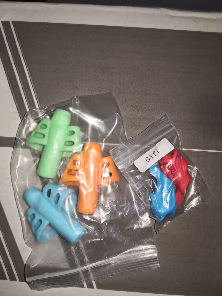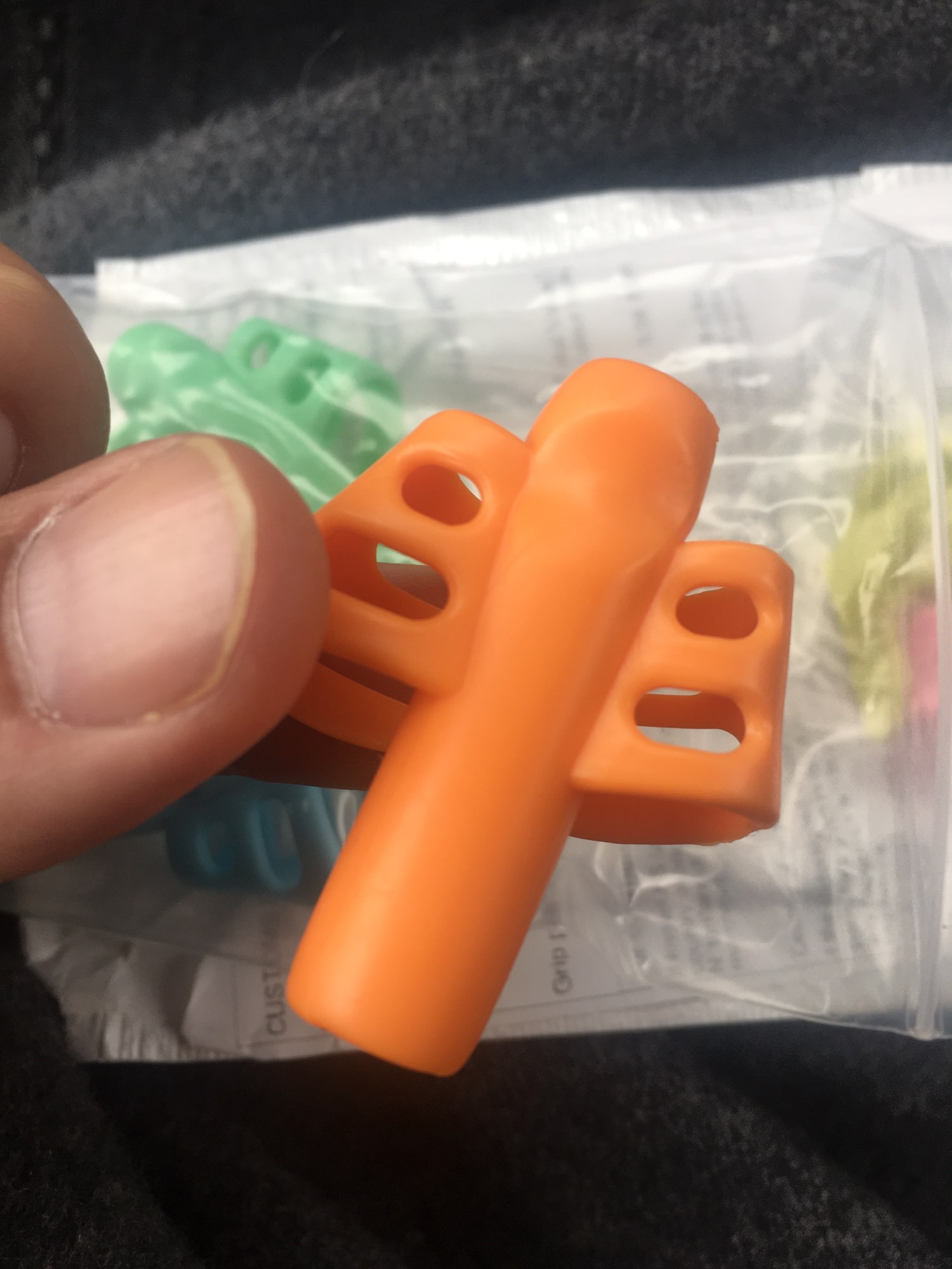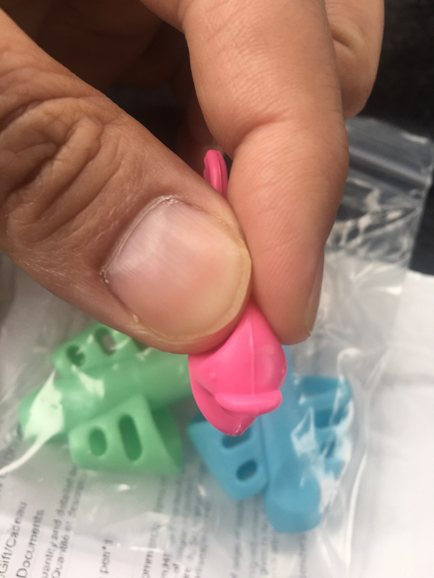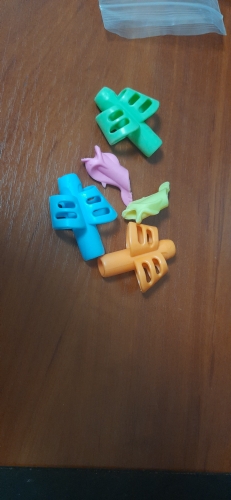 The goods are excellent. I ordered 2 sets. Good fixation of fingers, with a column for the middle finger, on the back. Came each with a gift in the form of two fish. I thought, the decoration, but it turned out that the comb of the fish also allows you to properly fix the fingers on the pencil. Very cool!!! Many thanks to the store. I recommend to everyone who has children learning to write.