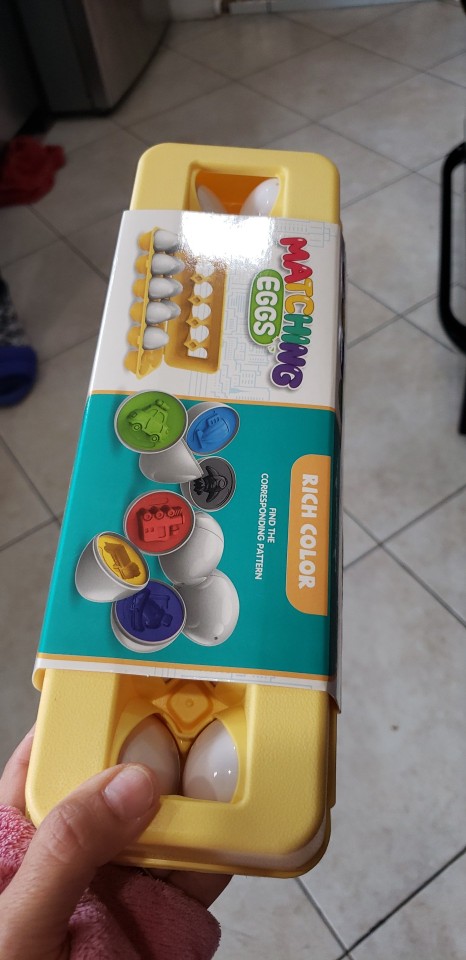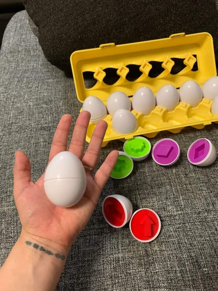 Match them with the color of the inside and the shape of the number, take the eggs out and put them back in the box, just like mom’s egg box. Kids are focused on the centers and matching the pieces. They come apart easily for little hands, but stick together well enough that they don’t fall apart when the toddler throws them around.