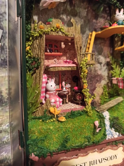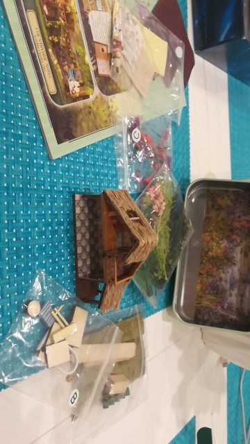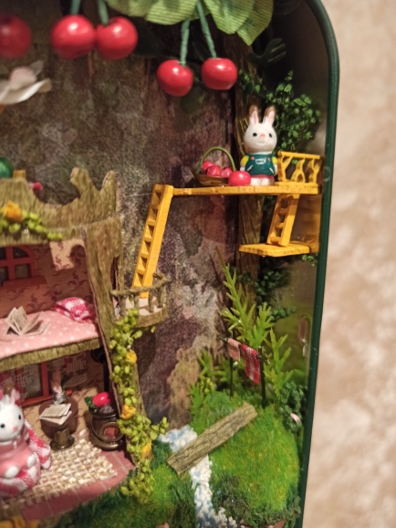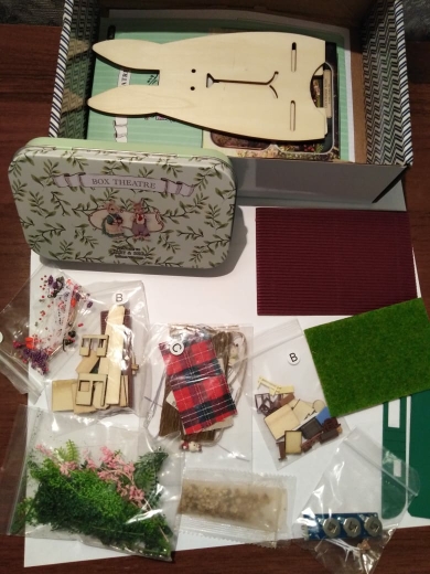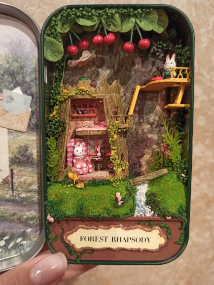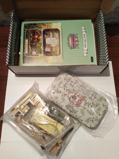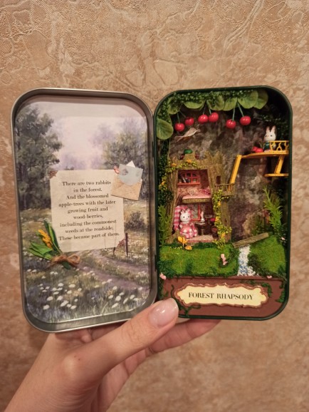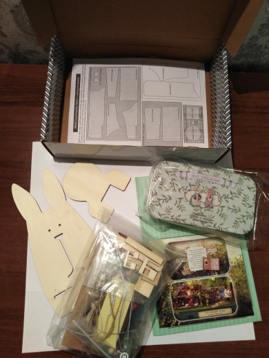 Wonderful set, I'm delighted! Included: tin box, details of the scene in signed bags, two LEDs, a chip for their connection, a manual book in English (very understandable in pictures, paper parts are cut out from it), Wooden stand for ready composition. No: glue, tweezers, batteries. The set parts are well detailed, the main material is paper, wood and dried flowers. The rabbits themselves are plastic. The Assembly took five evenings for two to three hours, very exciting, in places it is difficult because of very small details, in this regard the set is not suitable for children under 10 years of age and restless adults). Remained delighted despite some shortcomings, ordered the next set with cute bunnies :)