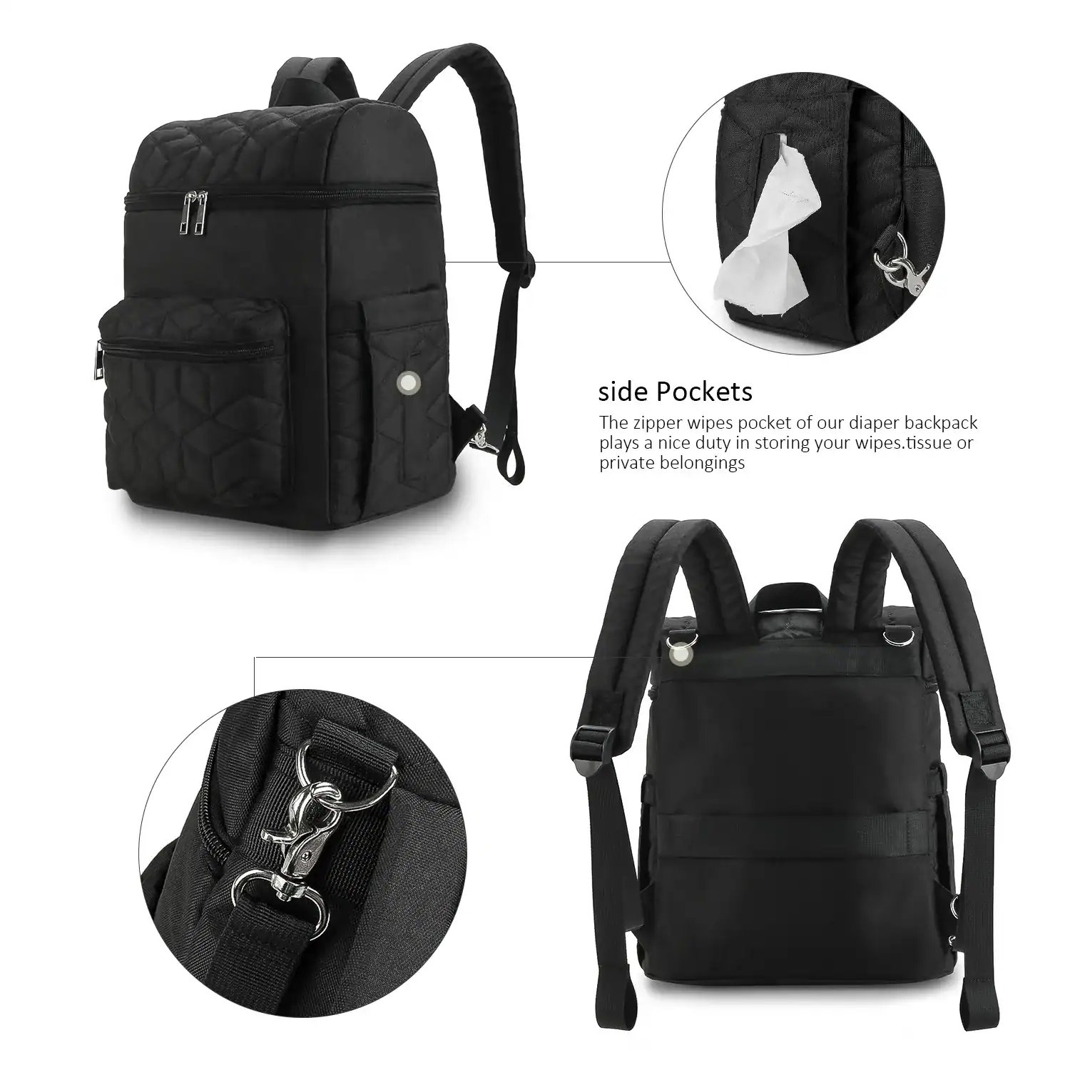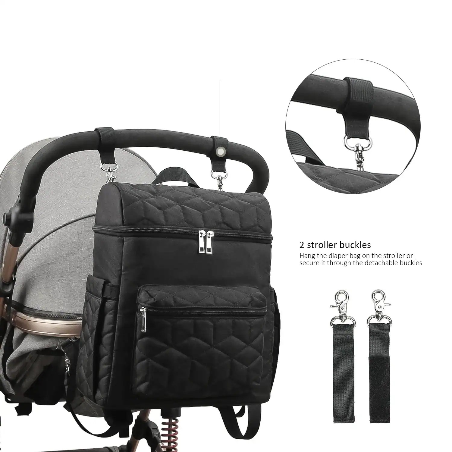 5. Stroller Straps: The bag includes adjustable stroller straps, allowing you to easily attach it to your baby’s stroller for hands-free convenience.