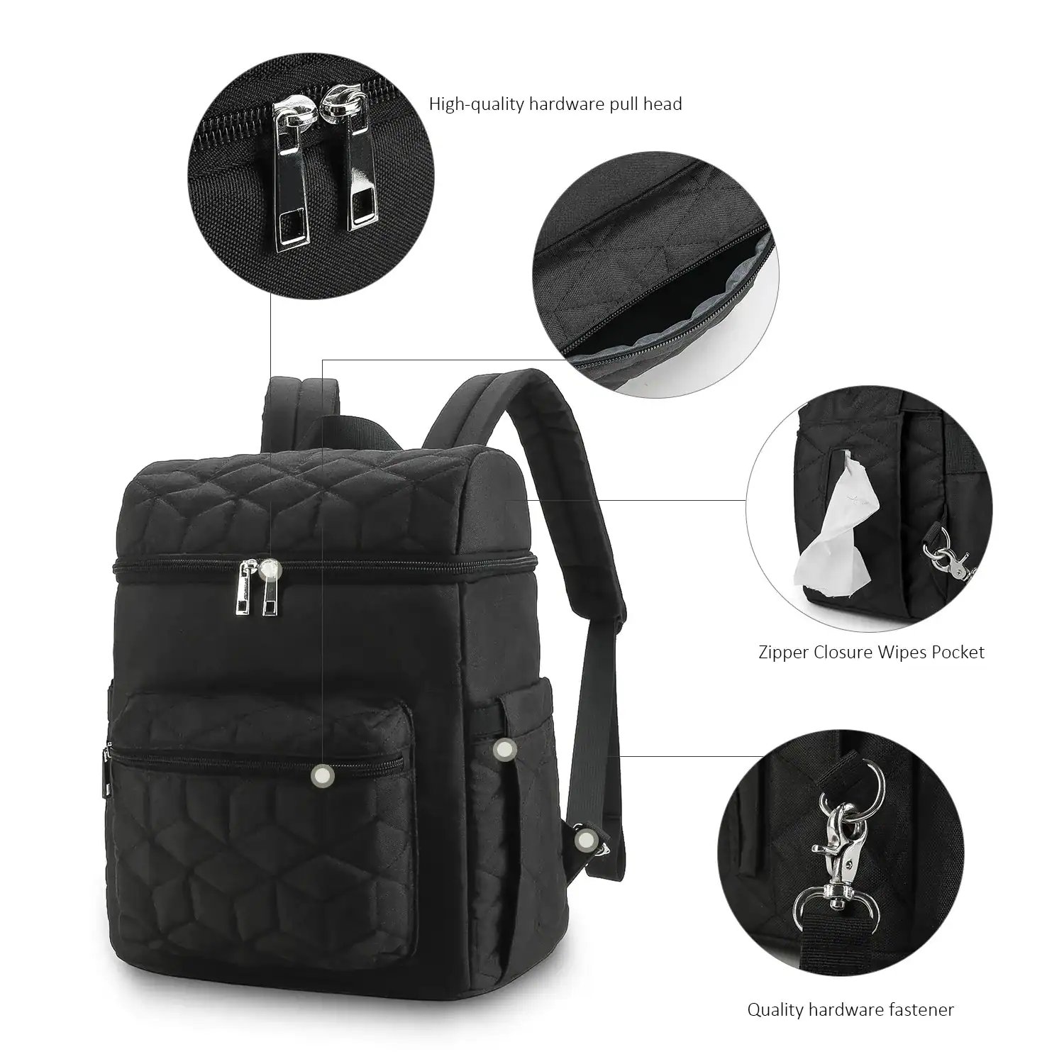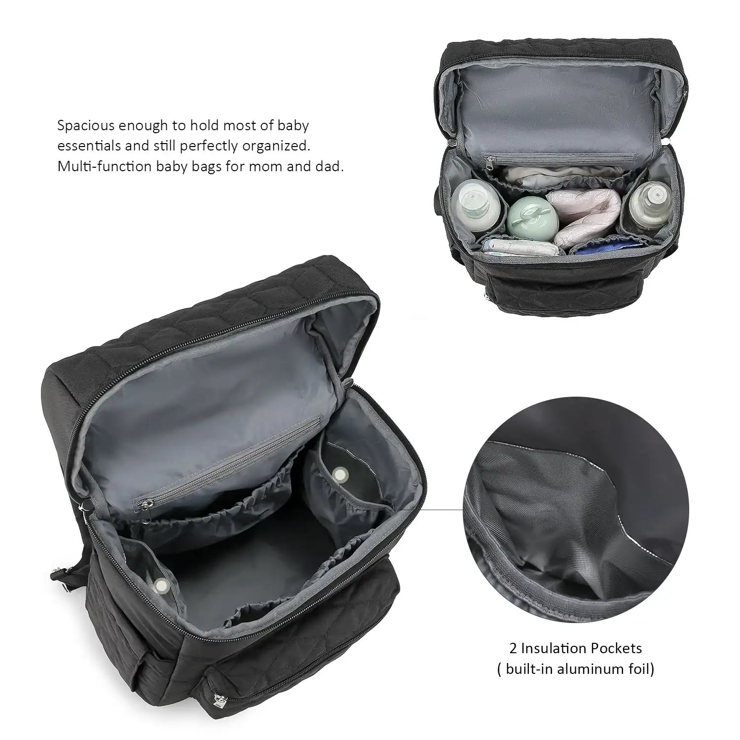 • Temperature Control: The insulated bottle pockets keep your baby’s milk or formula at the right temperature, ensuring it’s ready when needed.