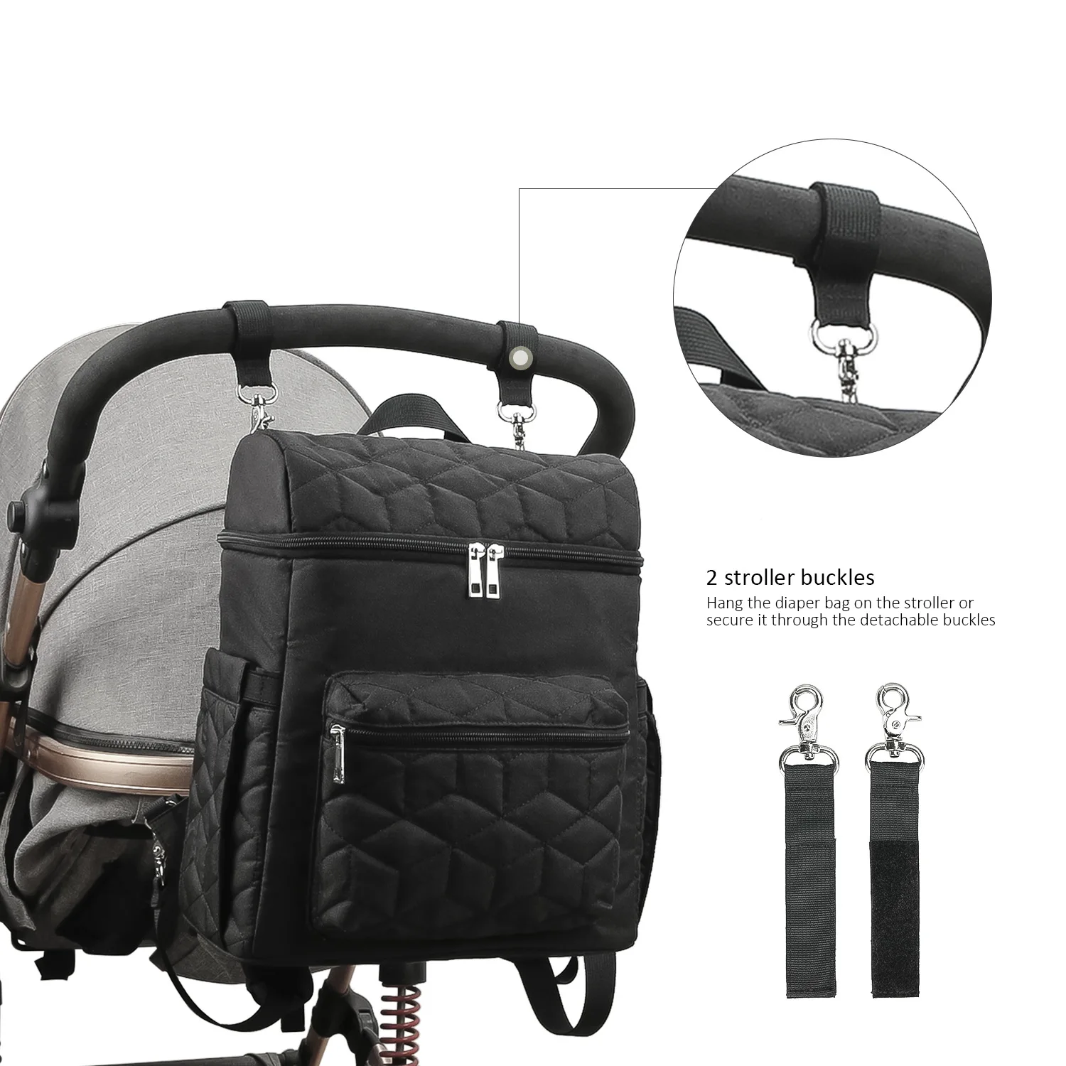 5. Stroller Straps: The bag includes adjustable stroller straps, allowing you to easily attach it to your baby’s stroller for hands-free convenience.