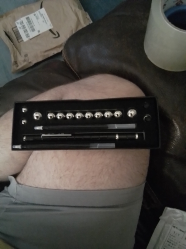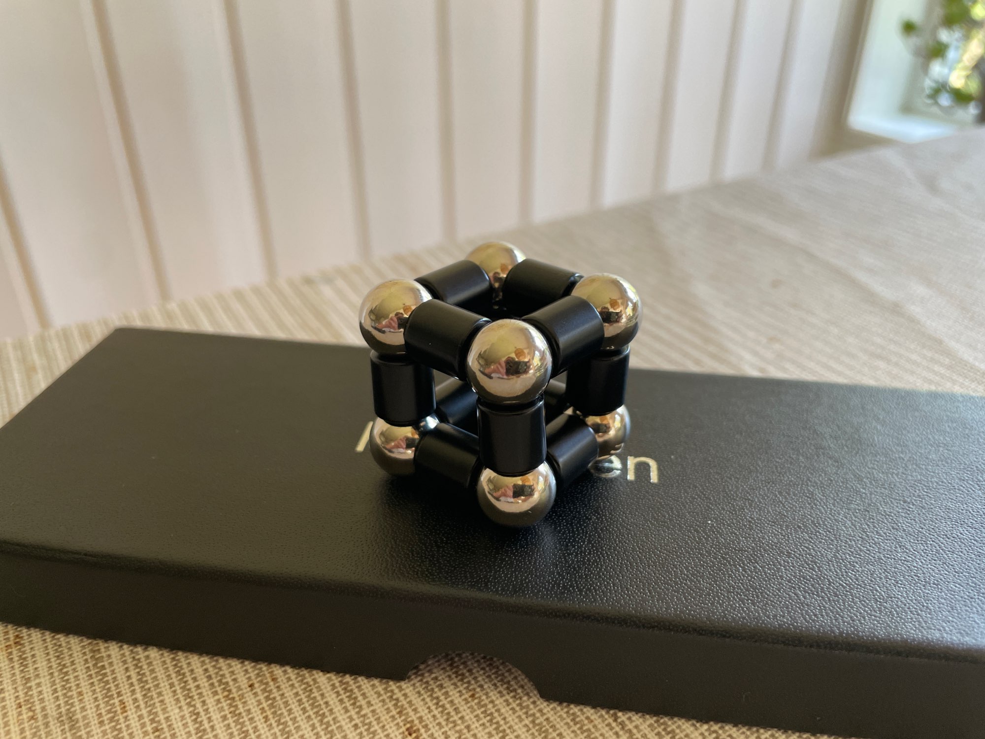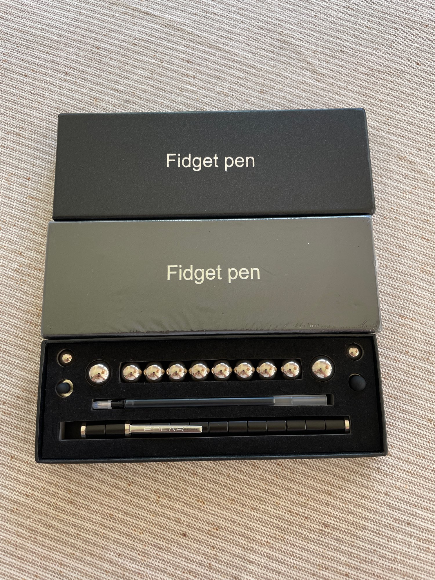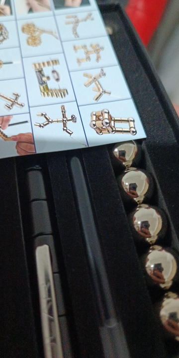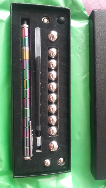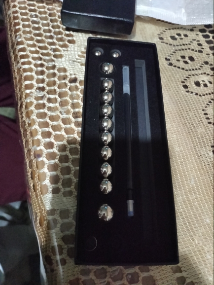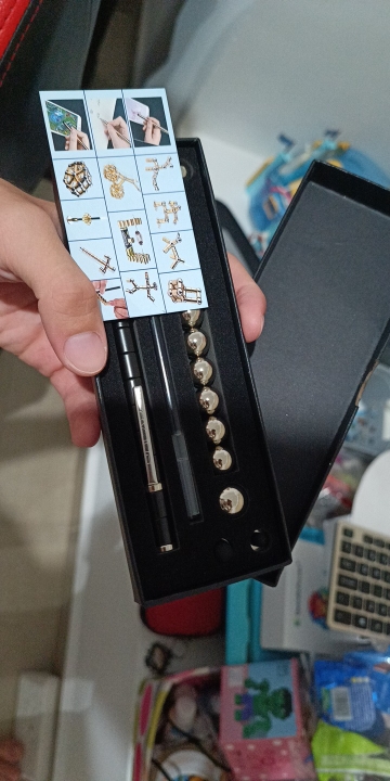 “Magnetic pen set includes”: 13 magnetic rings, 10 large steel balls, 2 small steel balls, 2 refills, 2 touch screen tips and a gift box.