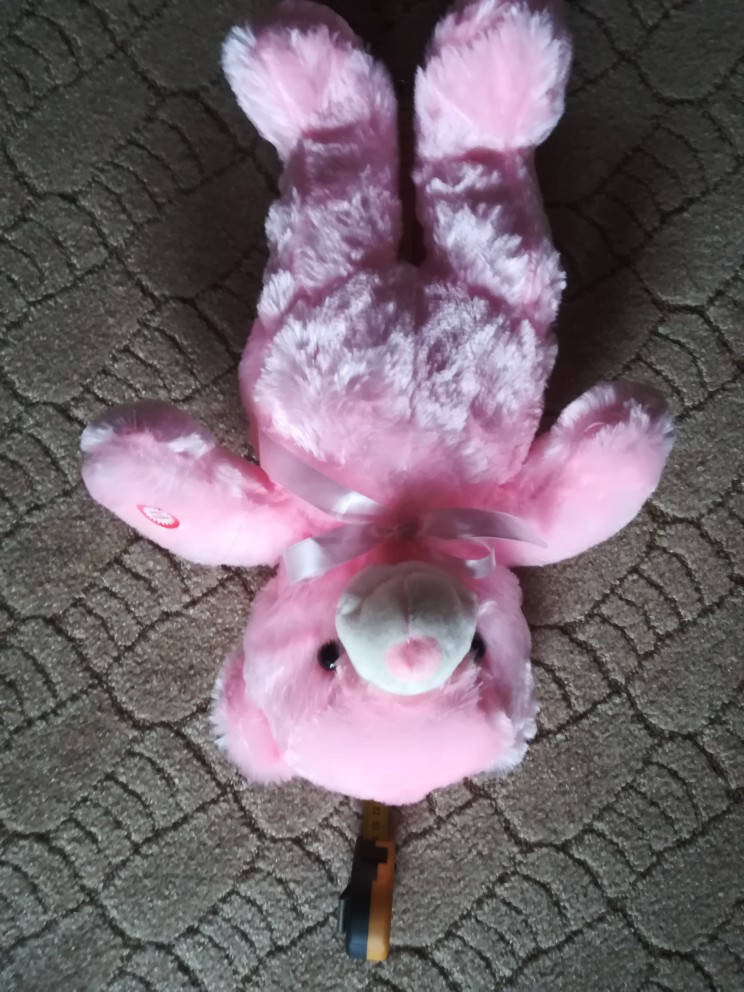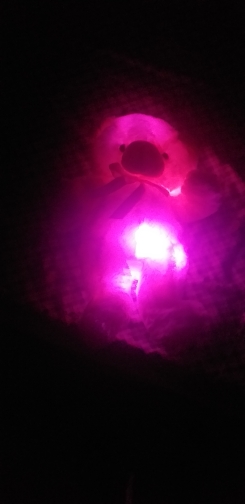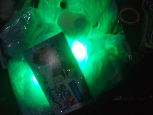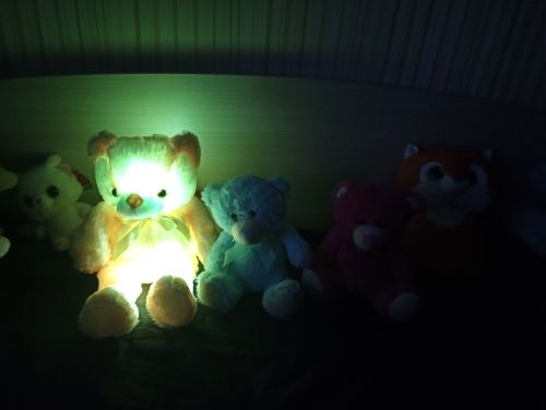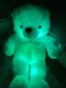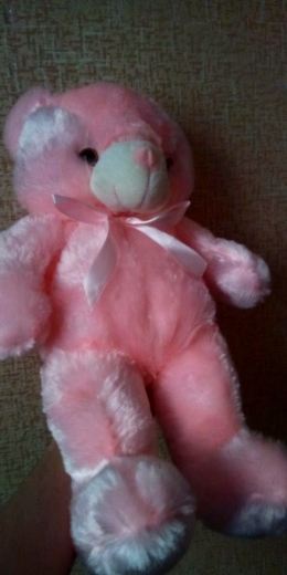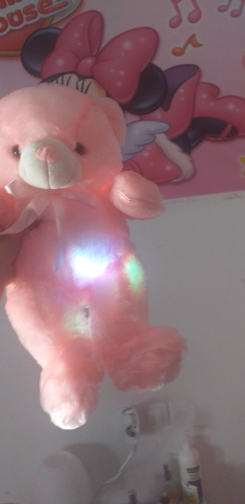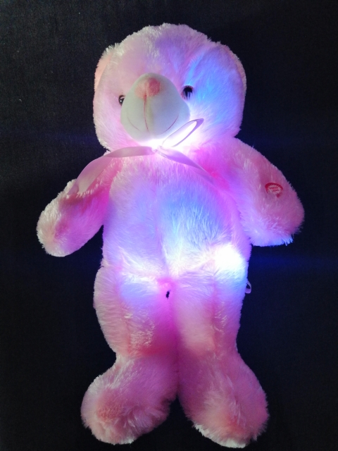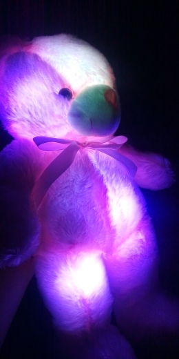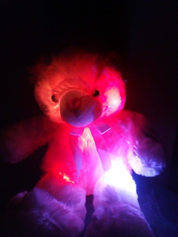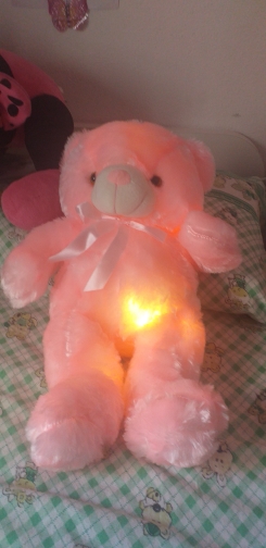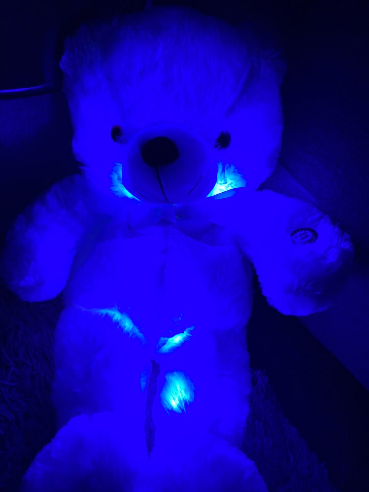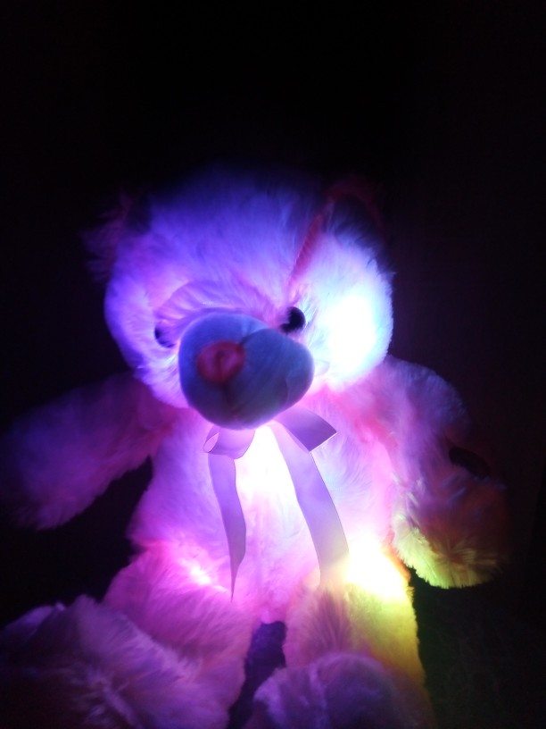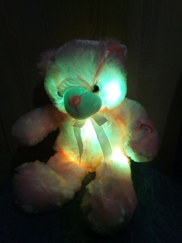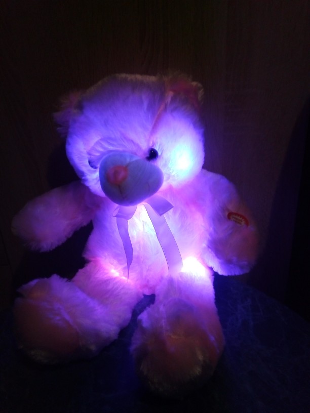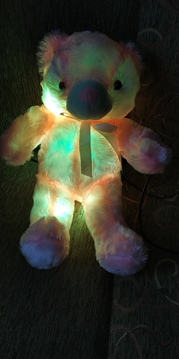 The bear is beautiful! Soft, pleasant, big. Works on three AA batteries, which are not included in the kit (buy yourself!). When you click on the paw begins from the inside (from the abdomen, from the sides and on the legs) slowly break in different colors (red, green, blue, white...). Looks fascinating even for parents! :)