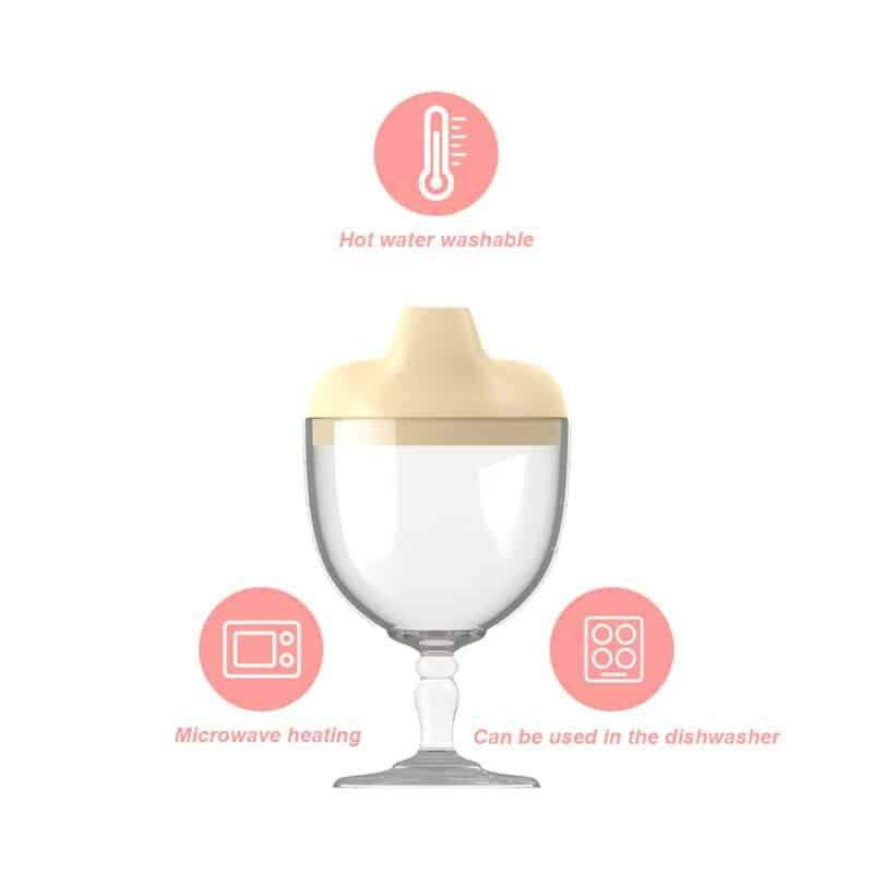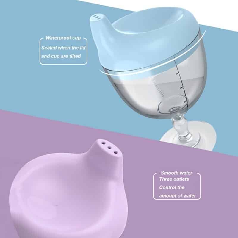 Great Design – A built-in closed plastic spill-proof sippy wine cups is included. The lid and the main body of the Goblet Sippy Cup for baby are sealed when it is tilted. The baby sippy cup’s innovative leak-proof construction prevents leakage even if it is turned upside down. The three water outlets provide the infant with more control over the water flow