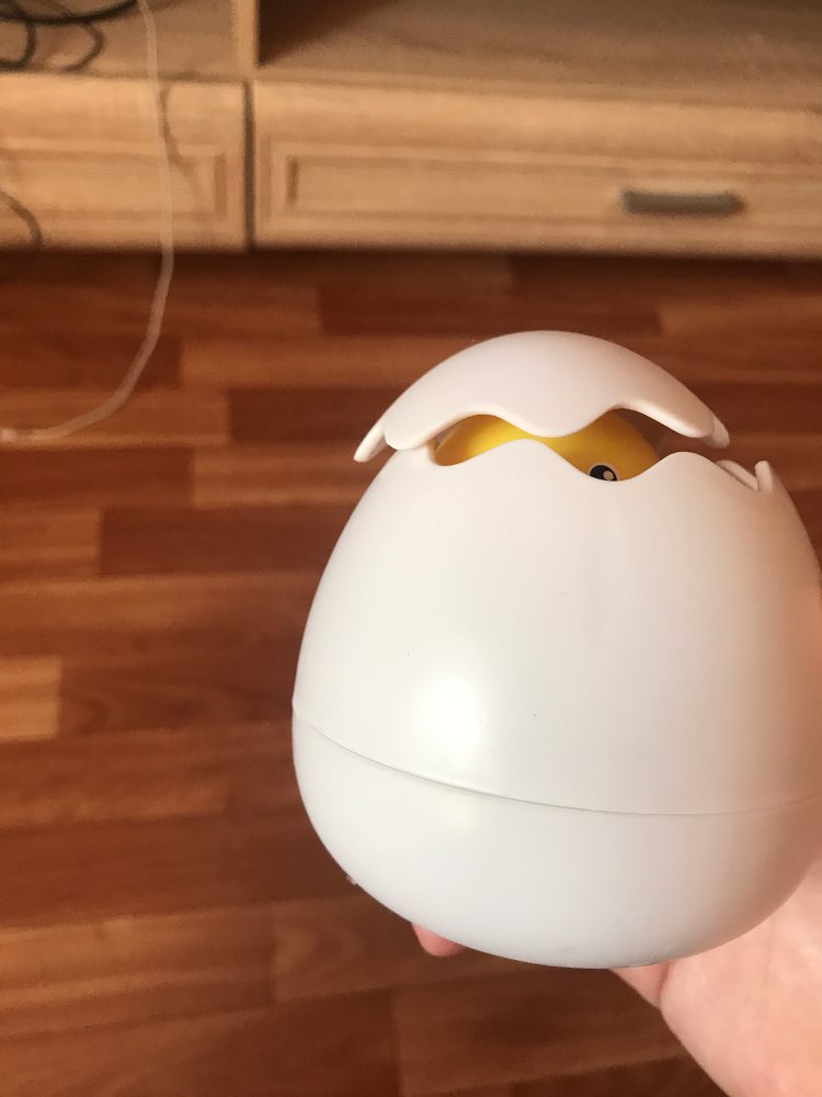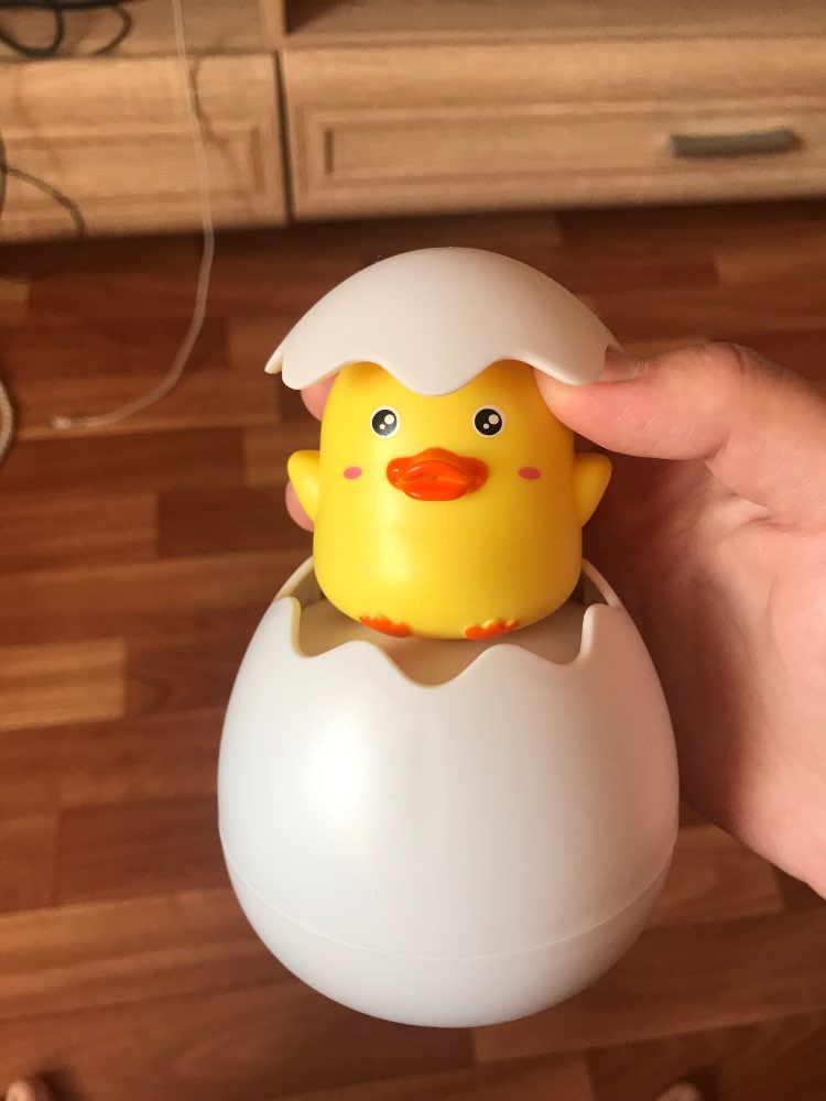Everything works. Immerse in water and the chicken is shown from the egg. Pull out and get a shower. If you press the upper part, holding the egg in the water and holding the chicken, the beak splashes water.