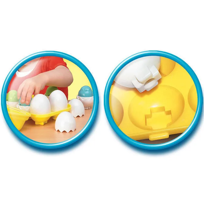 Two matching games in one! Includes six different eggs with unique colours and shapes.