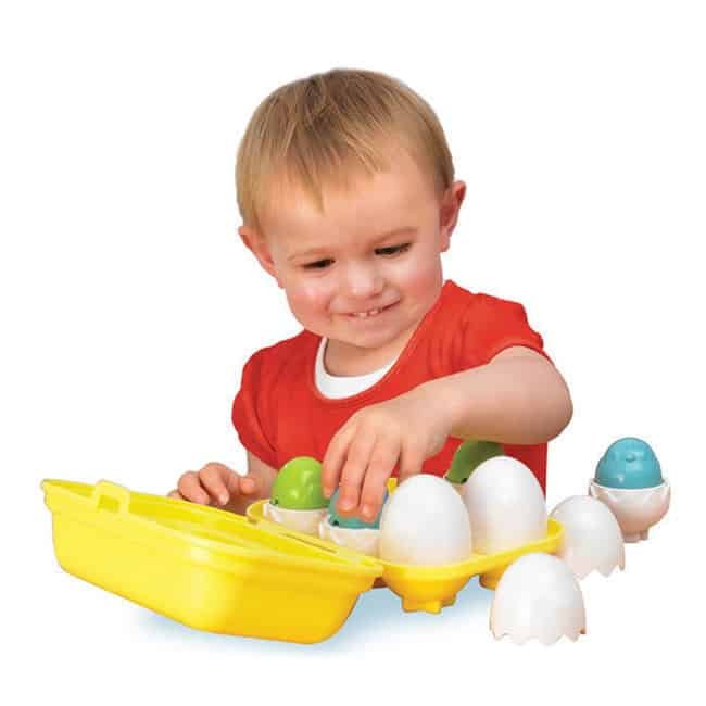 Different shapes on the bottom of the egg box offer shape-sorting fun too!