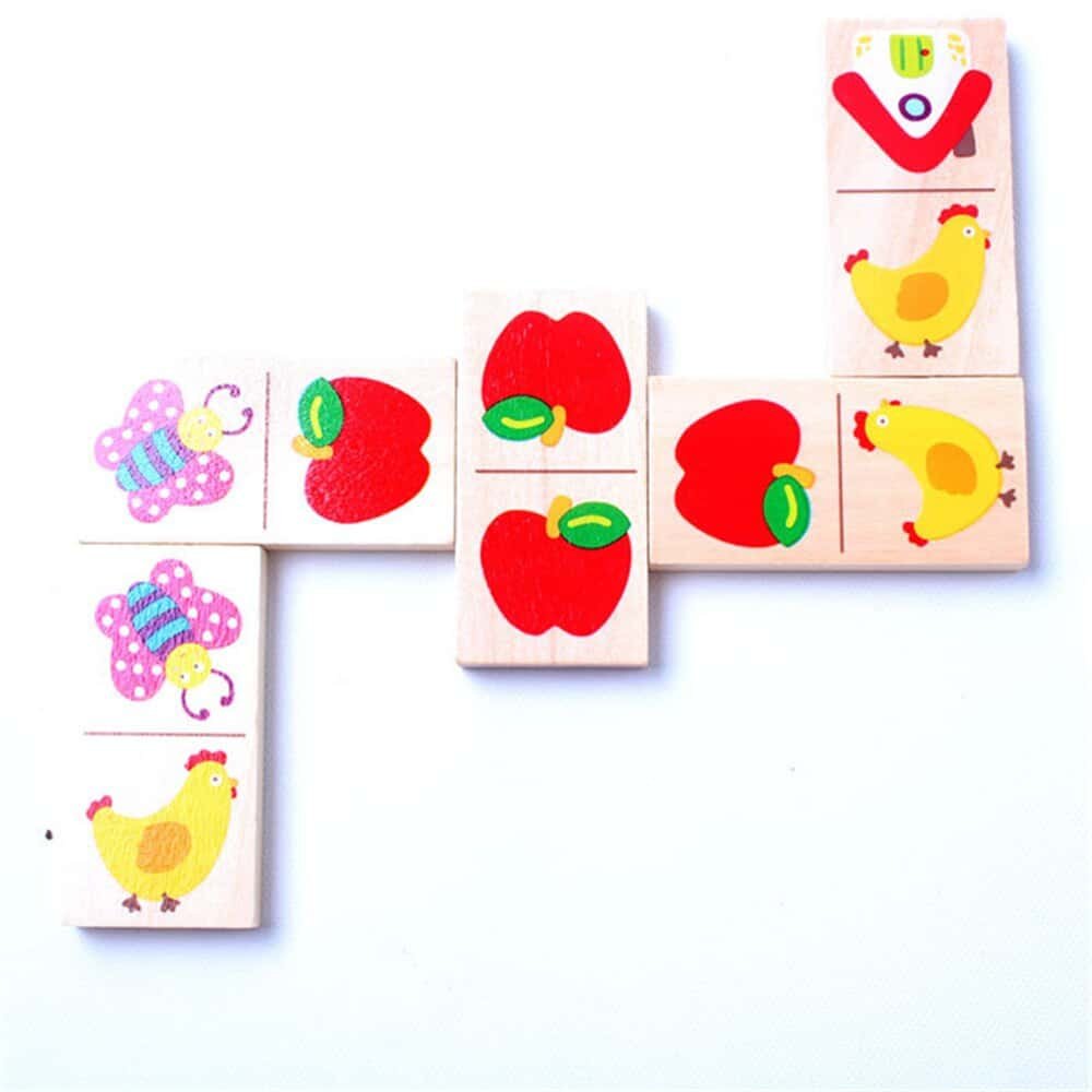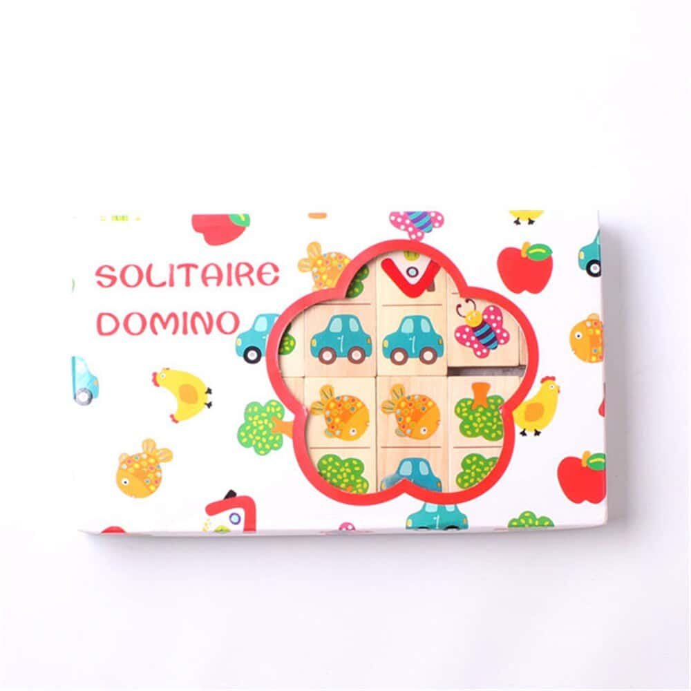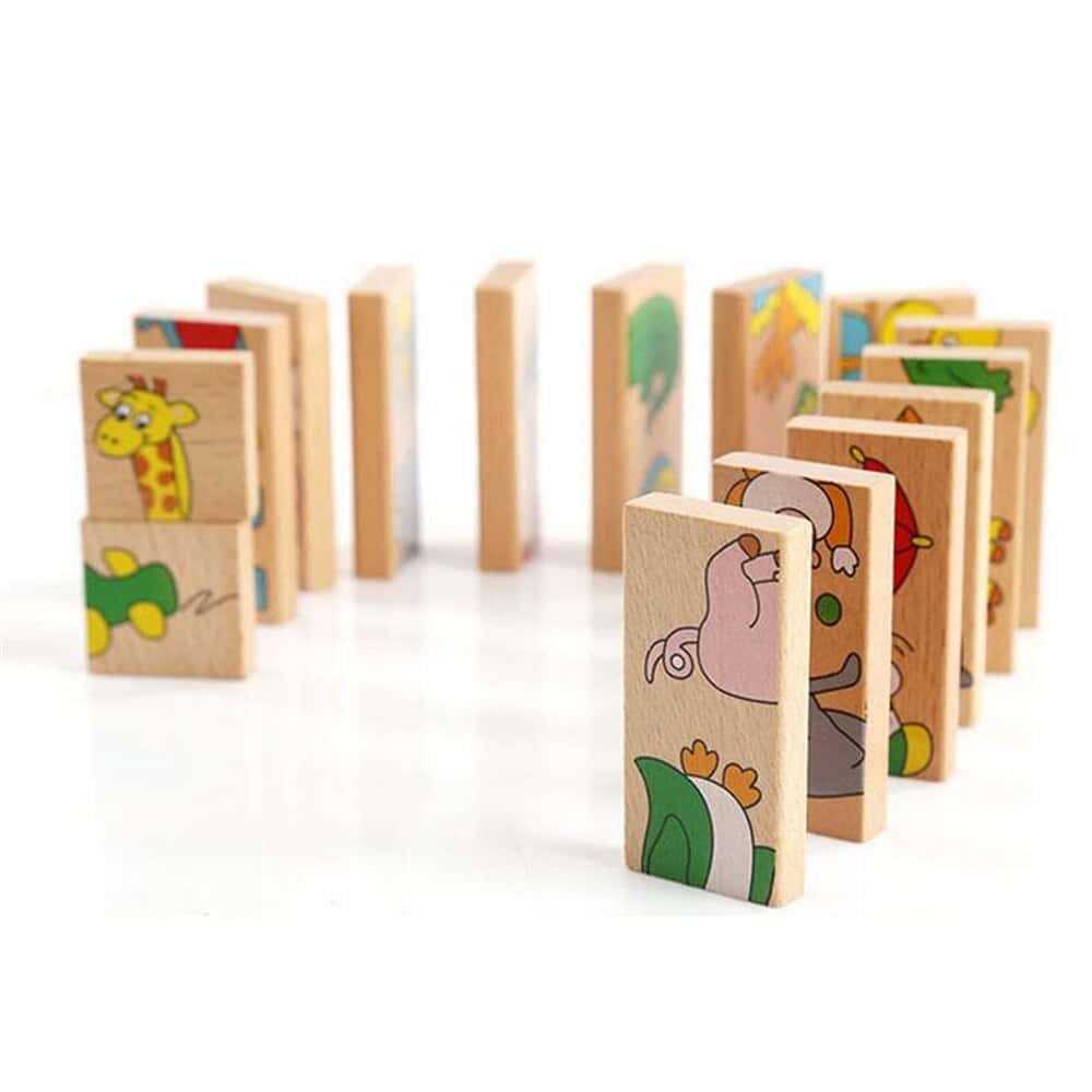 Beech wood, uniform slices, polished. 28 garden chromatic animal fruit transportation design, safe paint, quality is very good, can be upright for playing dominoes toppled game, also can flat out on the table playing solitaire, solitaire game, two pieces of domino connectors are attached to the design must be consistent, finally put all 24 pieces completed and connected into the ring game is completed., log more healthy environmental protection, edges are polished.