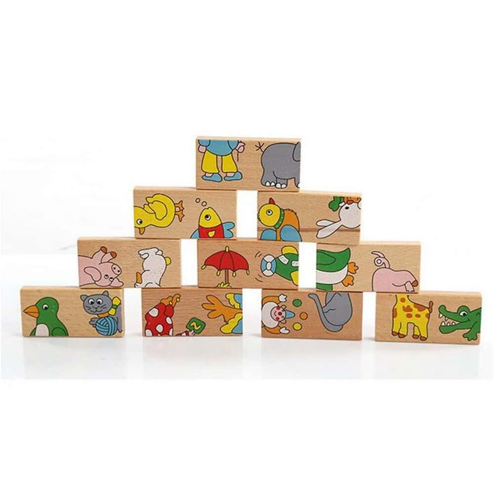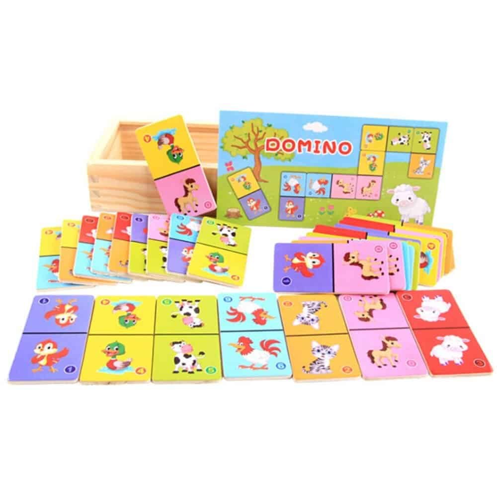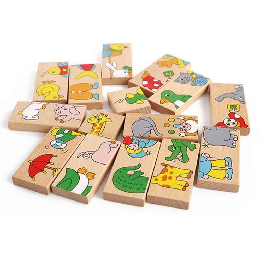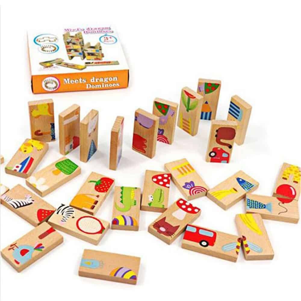 Beech wood, uniform slices, polished. 28 garden chromatic animal fruit transportation design, safe paint, quality is very good, can be upright for playing dominoes toppled game, also can flat out on the table playing solitaire, solitaire game, two pieces of domino connectors are attached to the design must be consistent, finally put all 24 pieces completed and connected into the ring game is completed., log more healthy environmental protection, edges are polished.