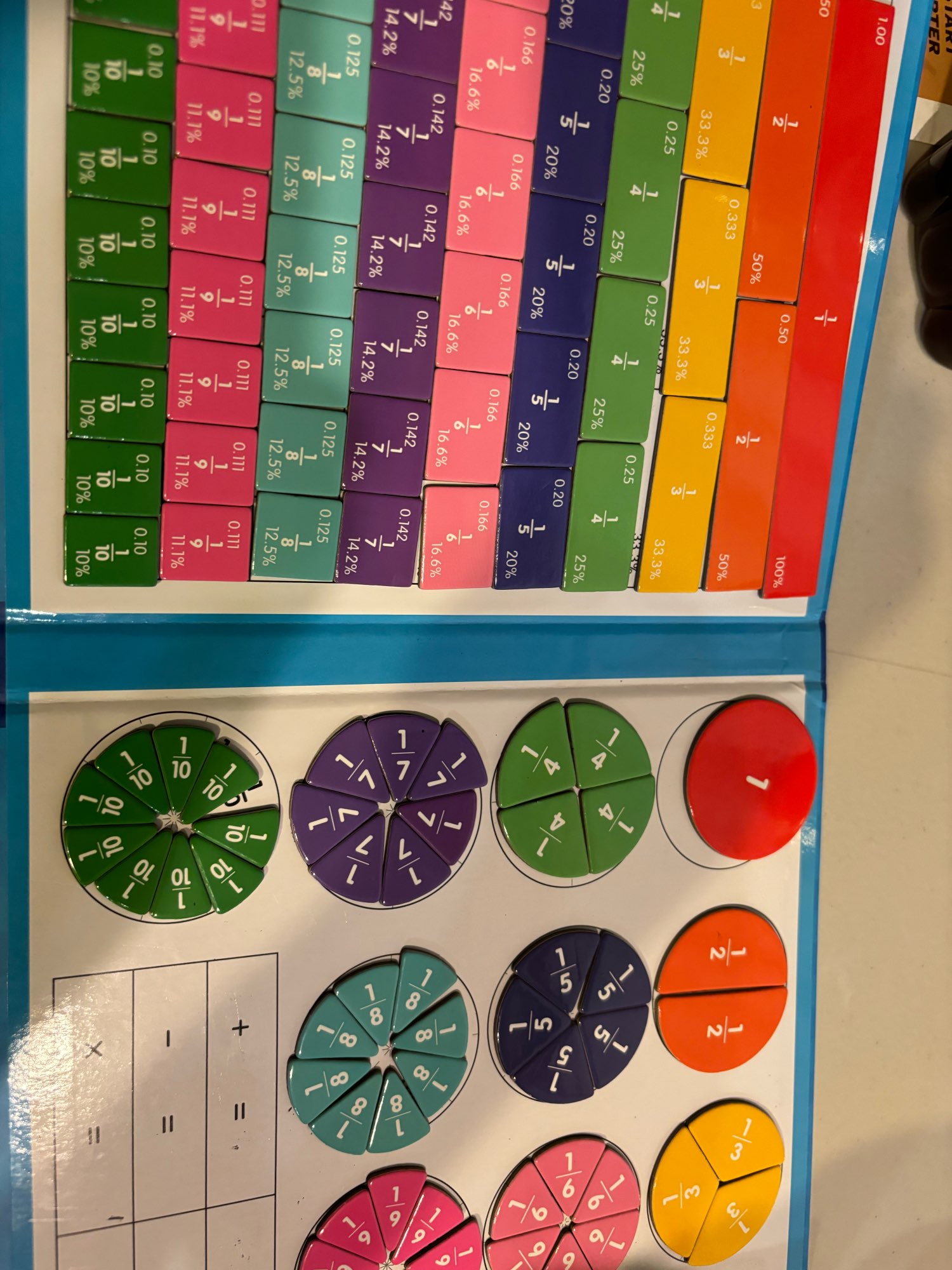 At first glance, the Magnetic Fraction Puzzle resembles a colorful mosaic, with each piece meticulously crafted to represent a fraction of a whole. The set typically includes a magnetic board as the base, adorned with gridlines and visual cues to aid in understanding fraction relationships. Accompanying this board are a variety of magnetized fraction pieces, each uniquely shaped and color-coded to represent different fractions.