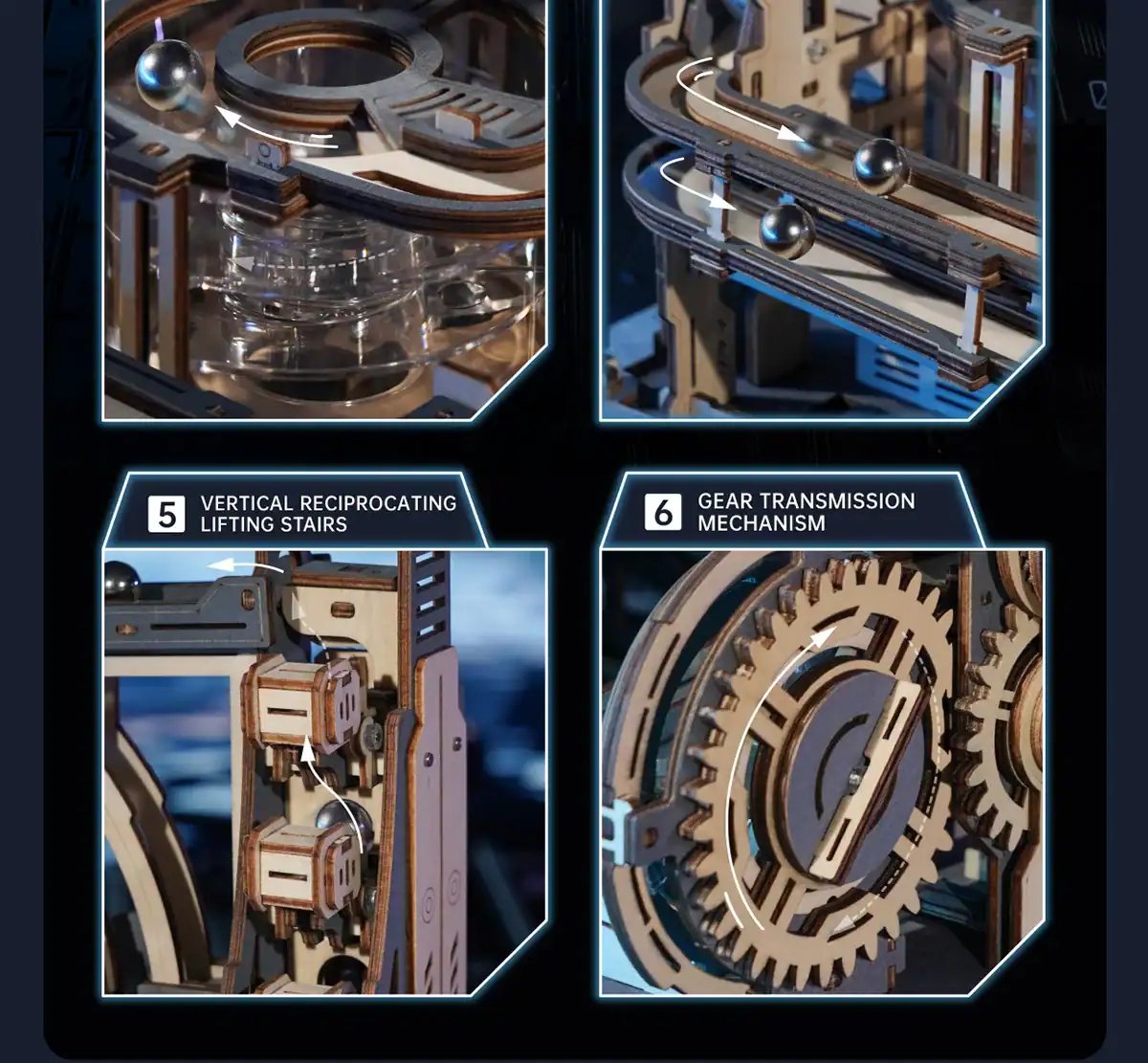 Dynamic Movement: Once assembled, watch the marbles travel through twists, turns, and drops, propelled by the meticulously designed gears and levers. It’s a satisfying and dynamic display that’s sure to captivate.