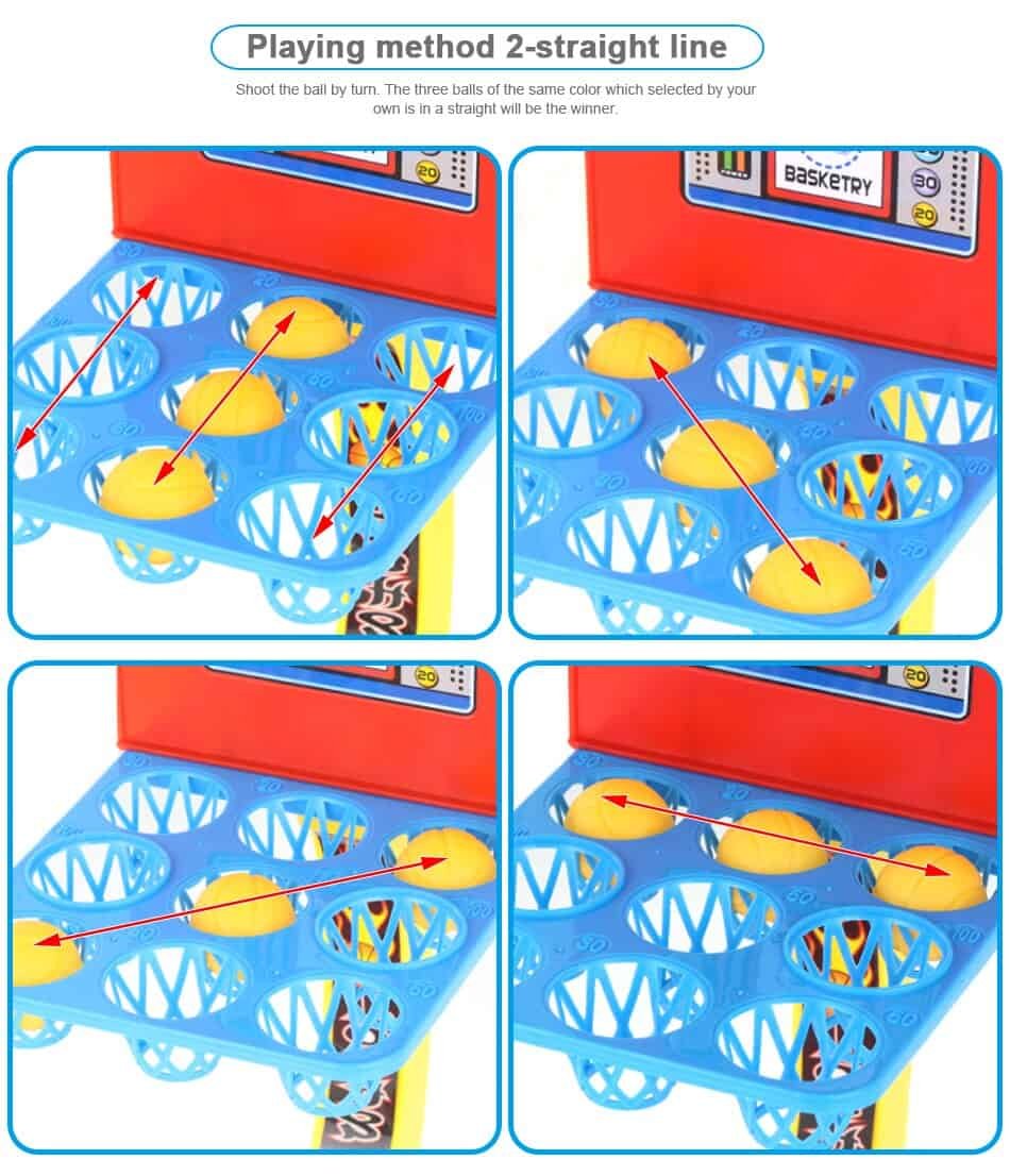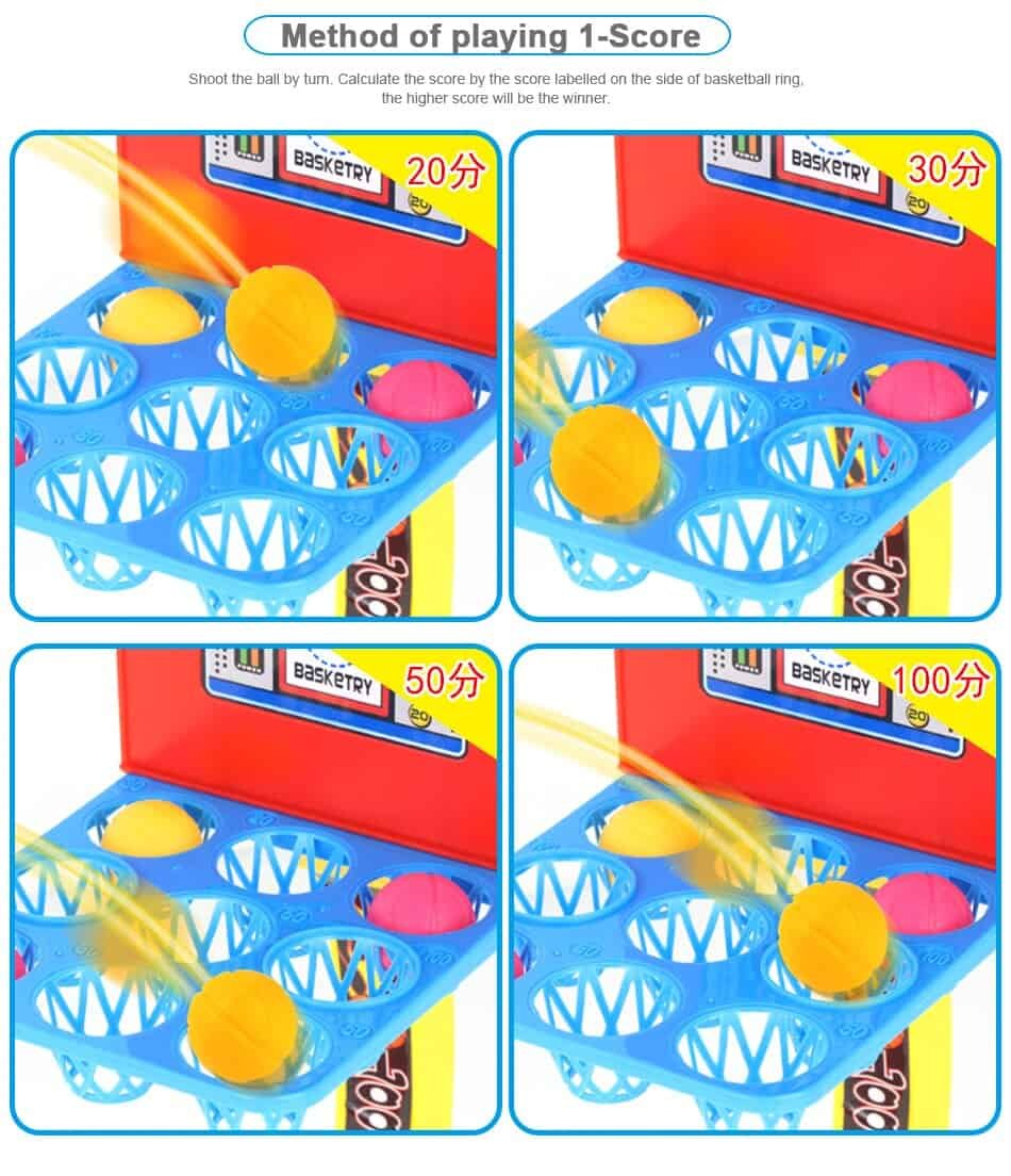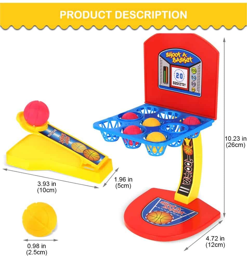 Basketball game for kids shoot baskets by pressing down on the launcher. Shoot, Score! First to score six points wins. With this classic game of basketball shootout challenge toy that can be played anytime or anywhere on a desktop, tabletop, dining table, countertop at home, office or hotel room either by yourself or with an opponent to compete and have a match. Your child can play the game with you or friends, it can help them to get along with each other more harmoniously.