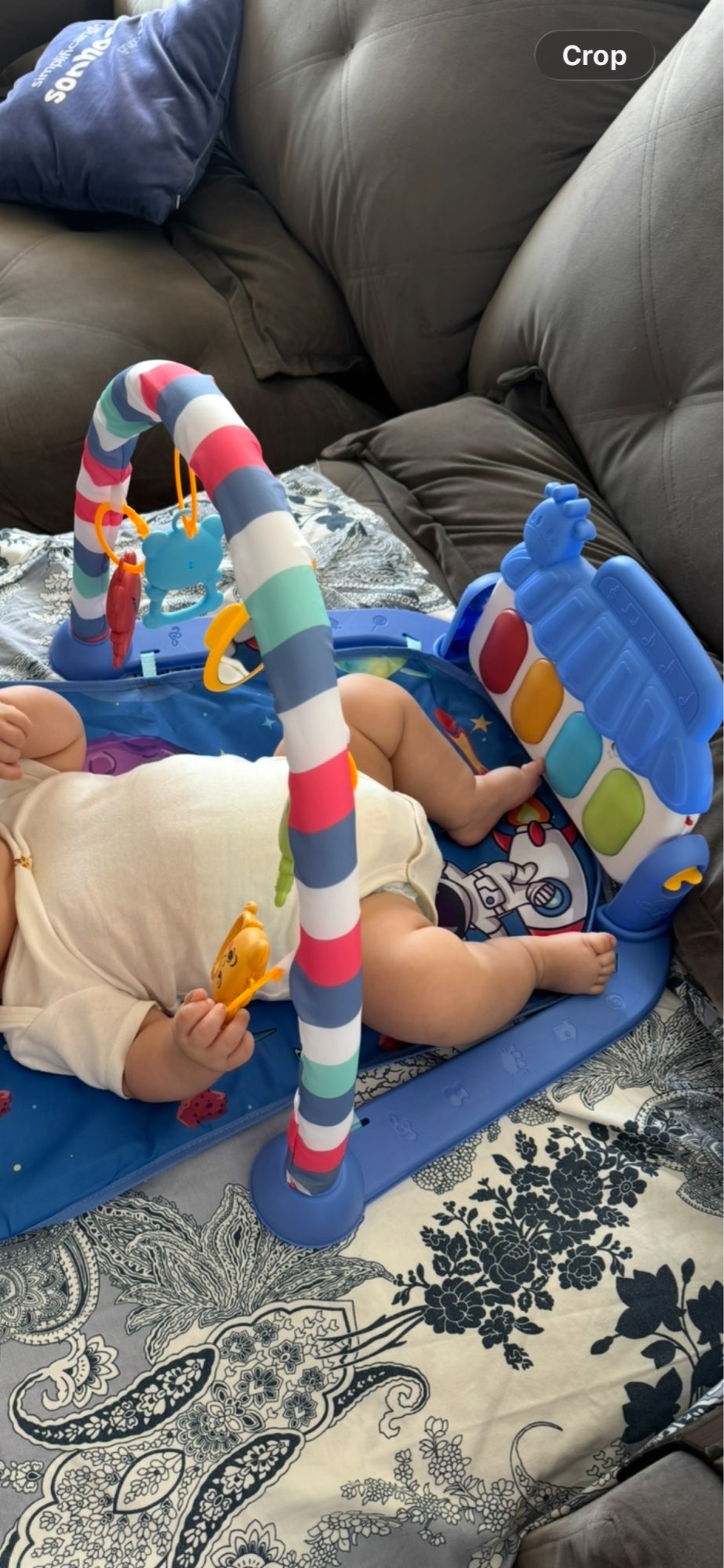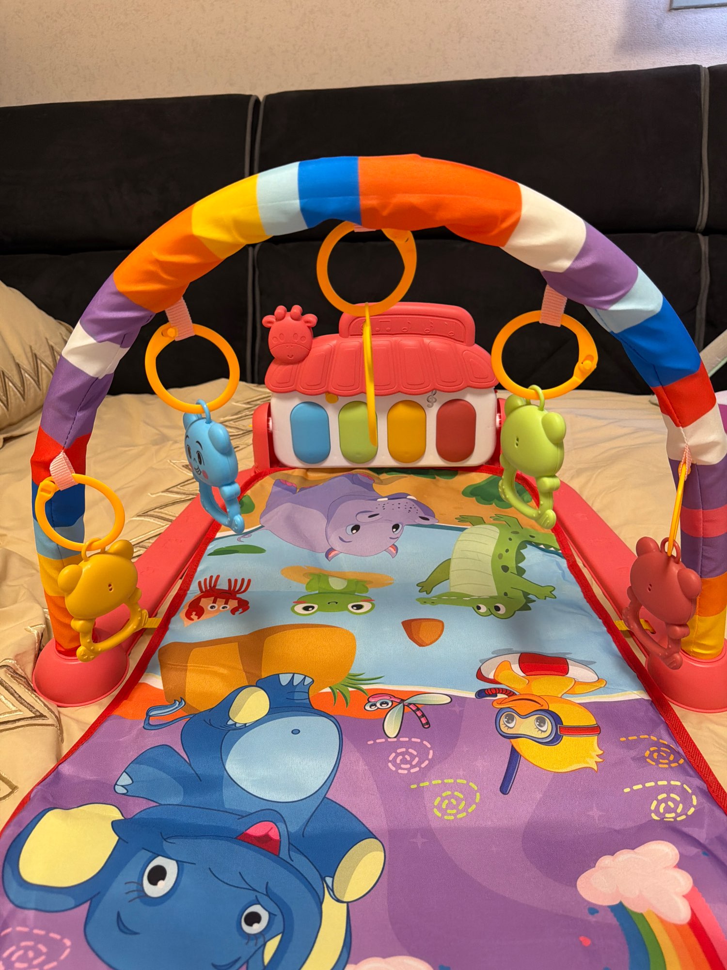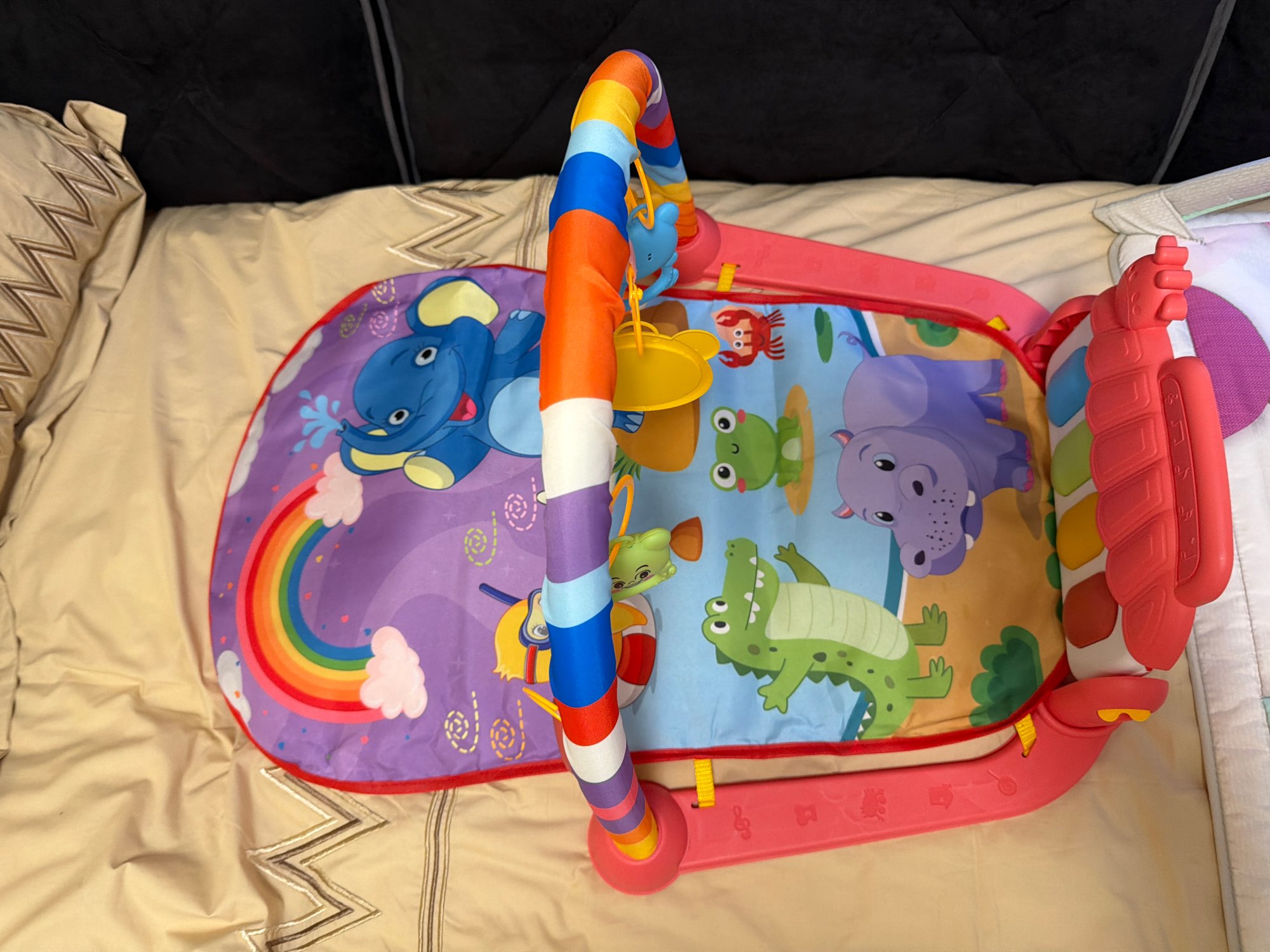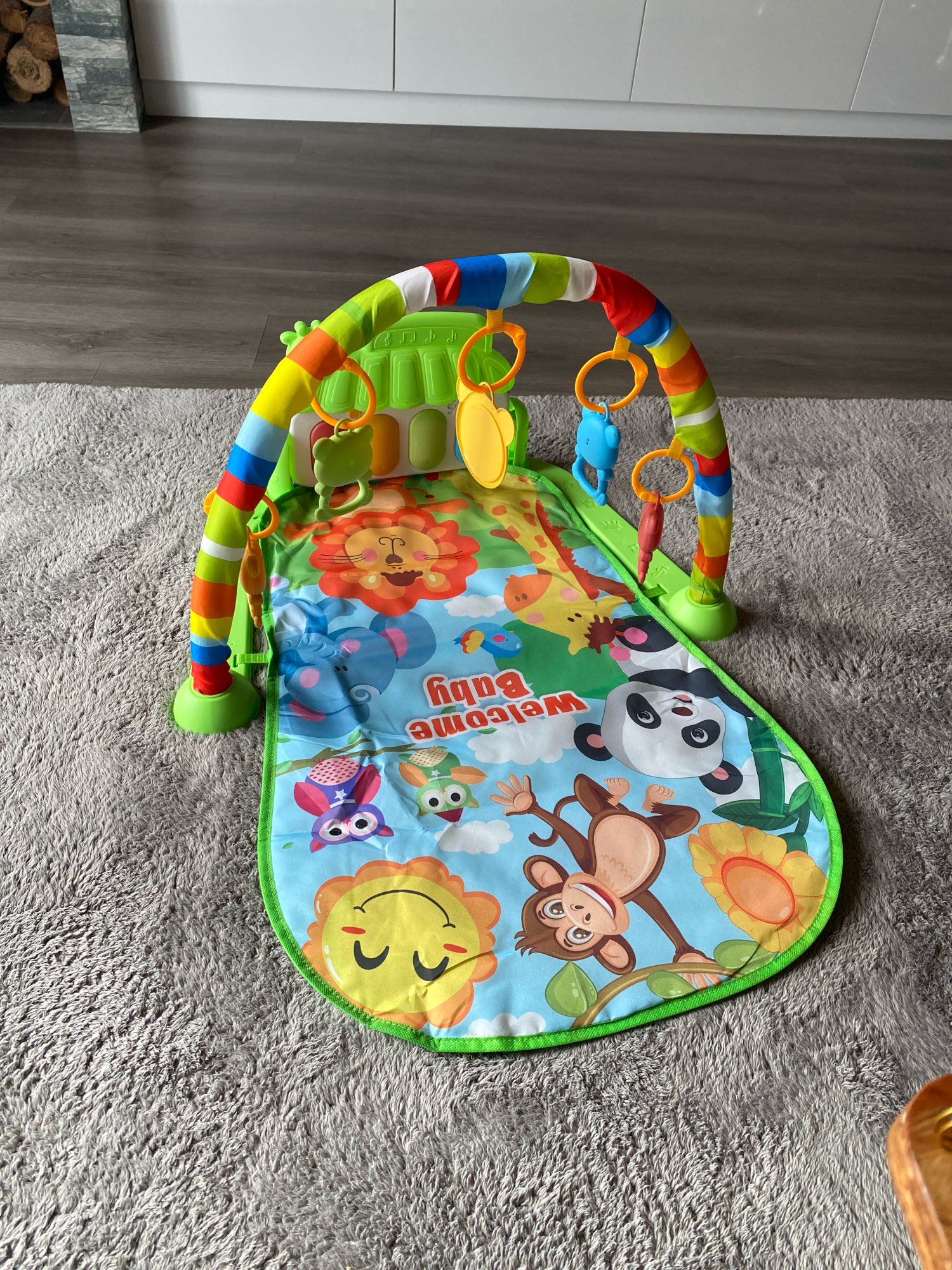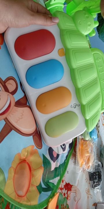 3. Interactive Elements: The mat includes various interactive features such as crinkly textures, squeakers, and detachable toys that encourage sensory exploration and fine motor skills development. These elements are strategically placed to engage your child and promote active play.