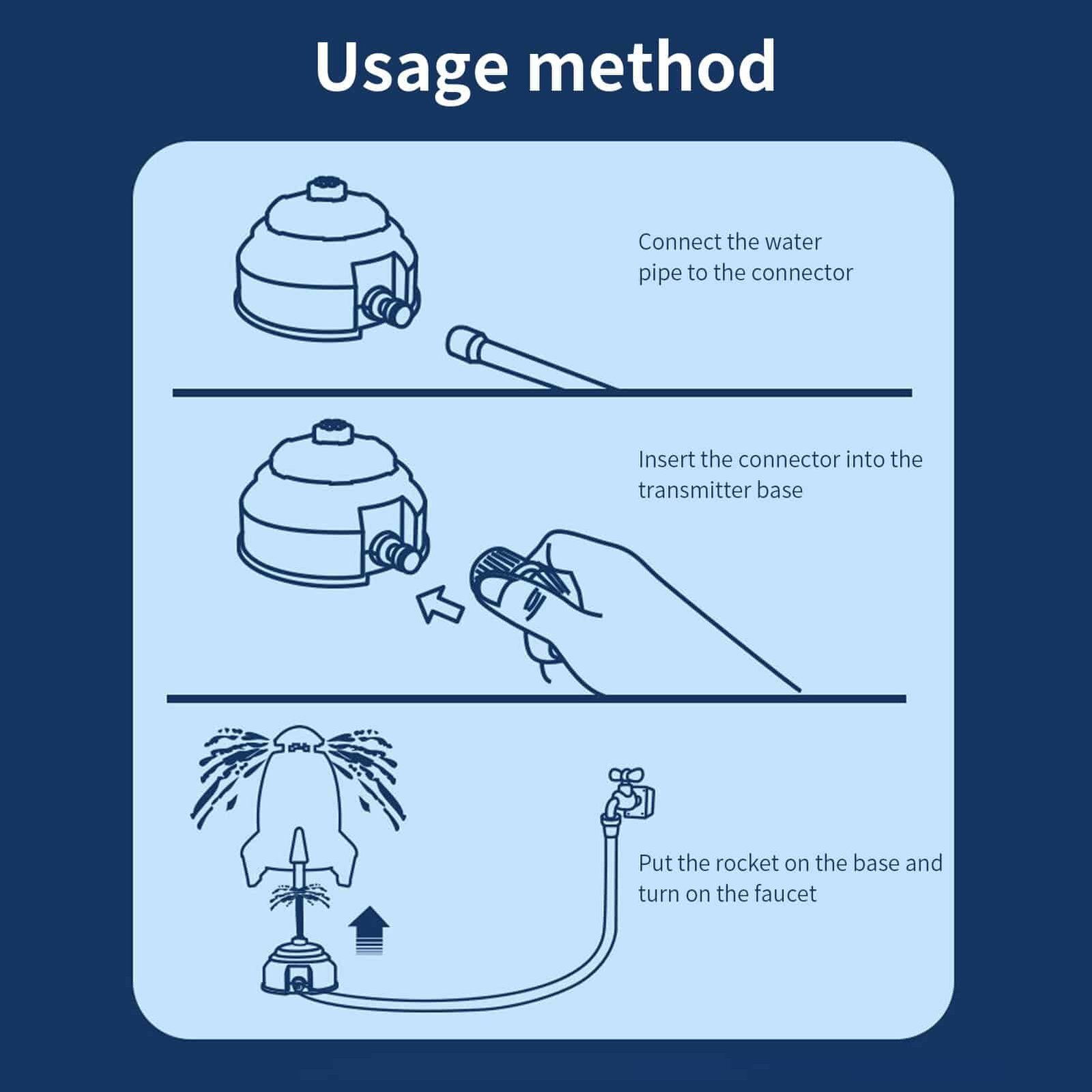 Easy to use, Connect the water pipe to the connector, insert the connector into the transmitter base, last, put the rocket on the base and turn on the faucet.