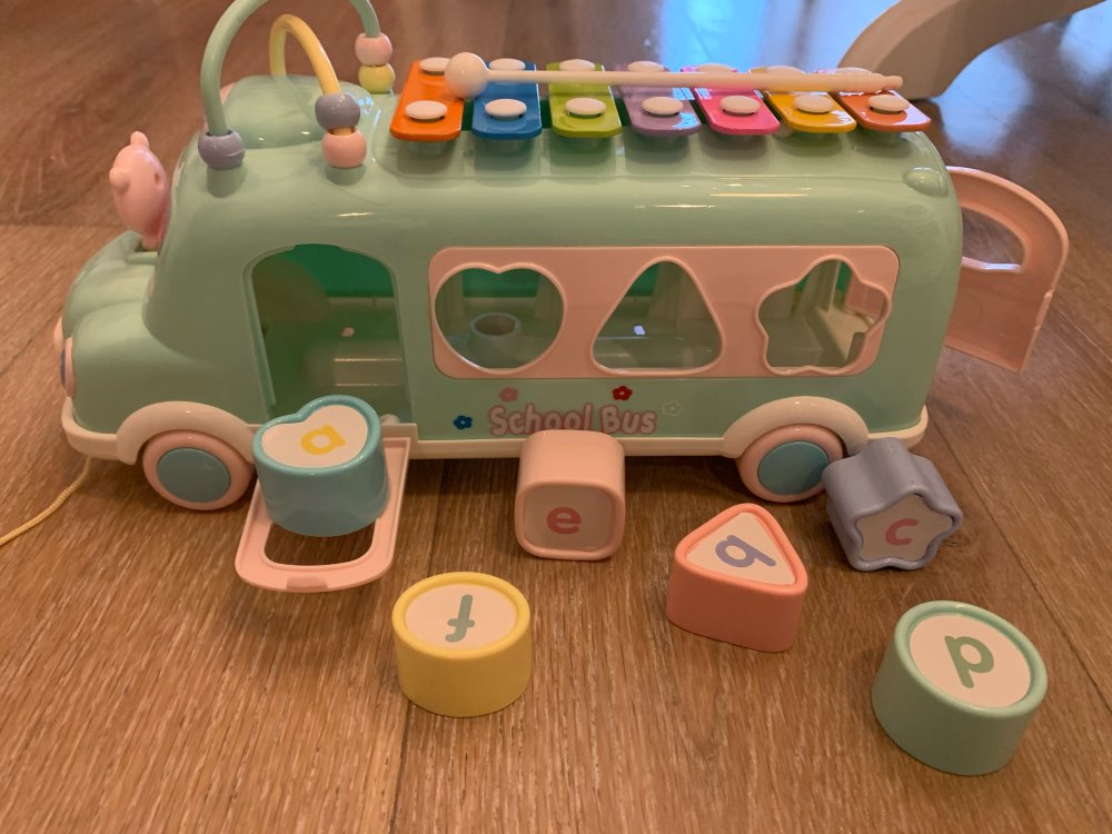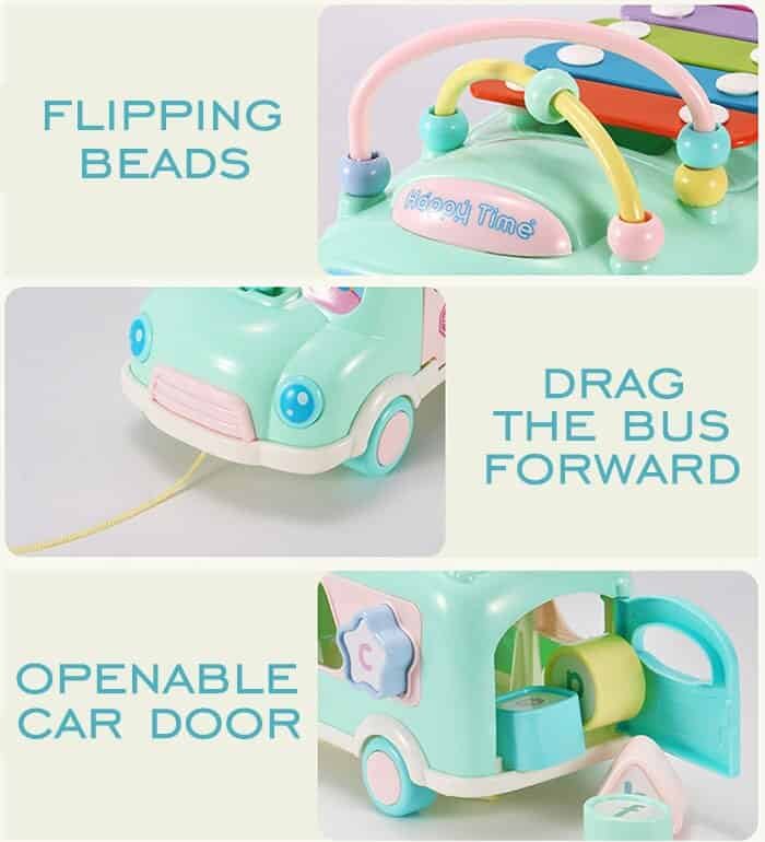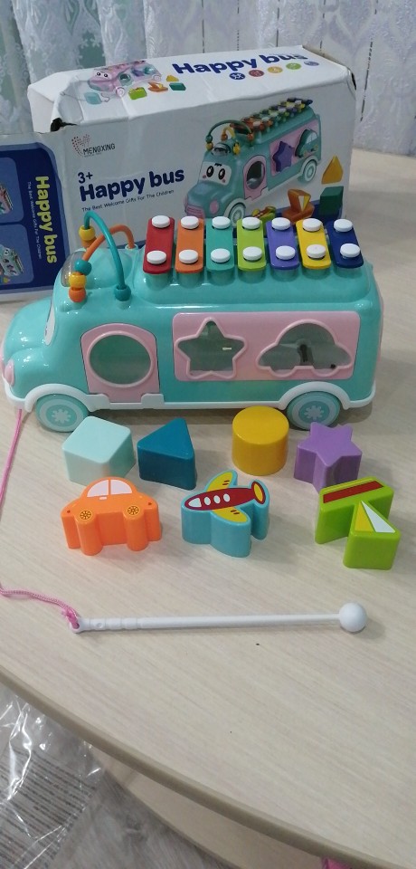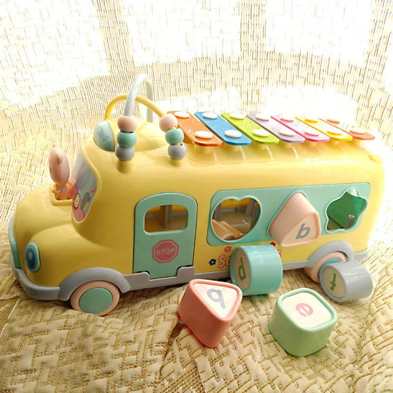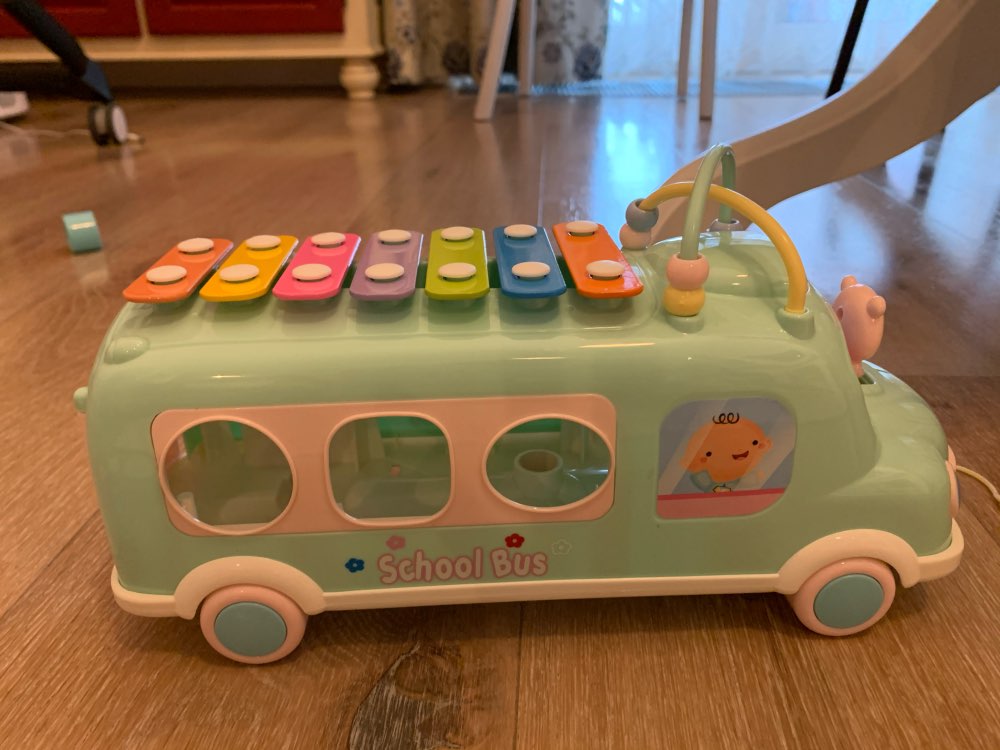 This Plastic Xylophone Bus is so fun! Multi-functional: push/pull along car, xylophone, shapes toys and more. Non-toxic and no easily deformed.