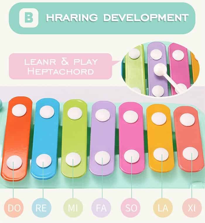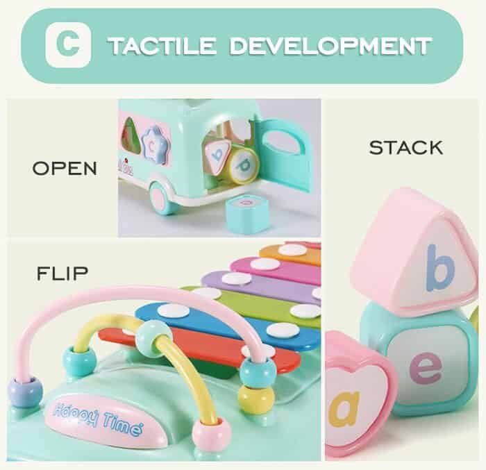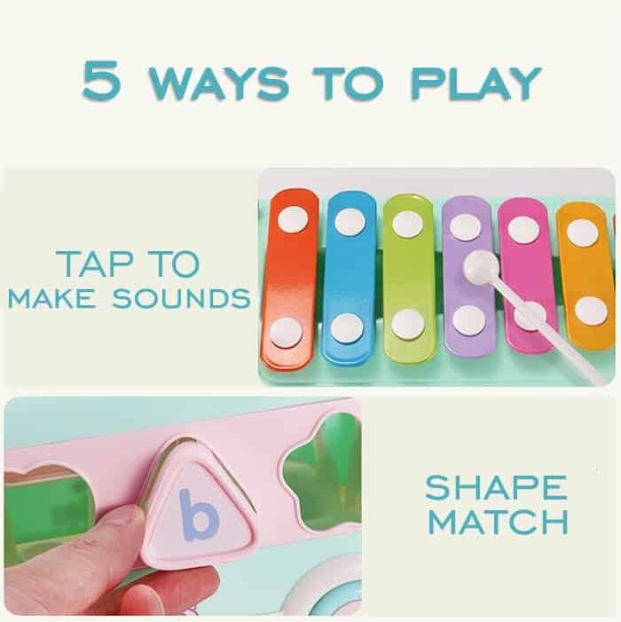 🎵 SORT THE SHAPES: This baby toys 12-18 months and up musical instruments come with seven uniquely shaped blocks, and each one fits into a matching hole on the side of the music bus. Your baby xylophone 1 year old xylophone will make a game out of figuring out which block fits where, all while improving his fine motor skills.