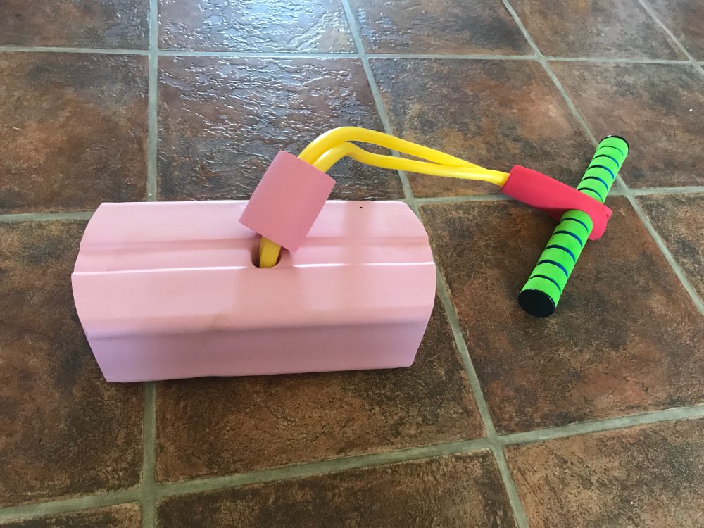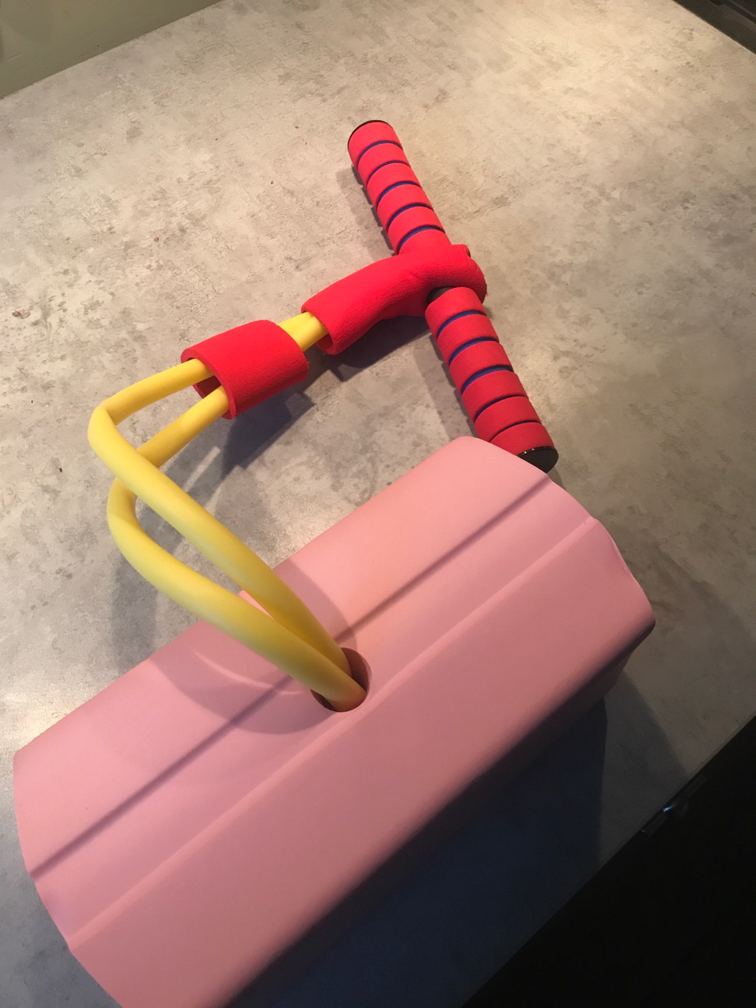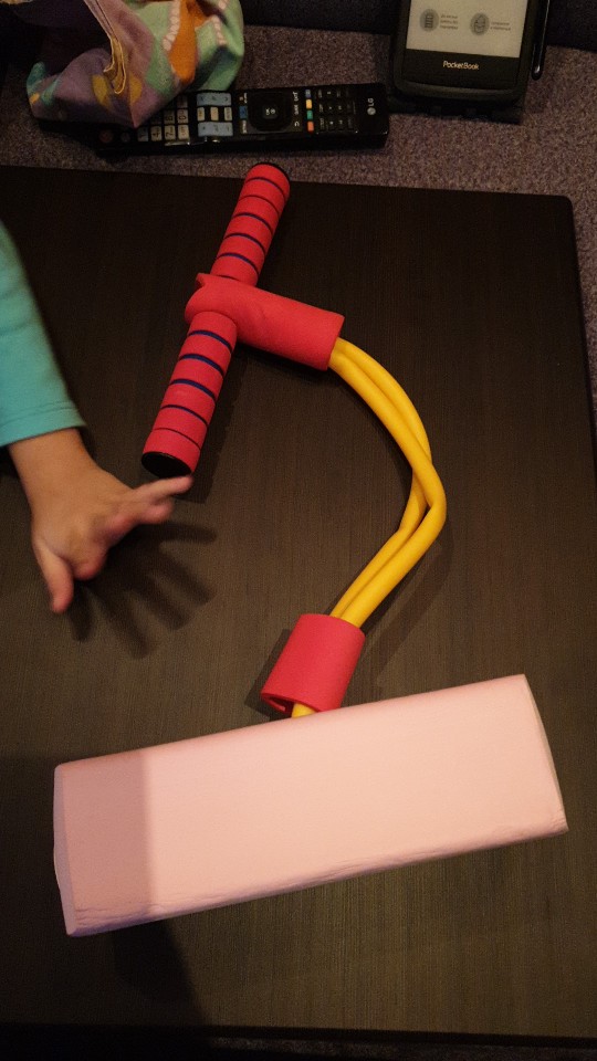 Foam sticks also feature handlebars, like a bike, and a place to put your feet.