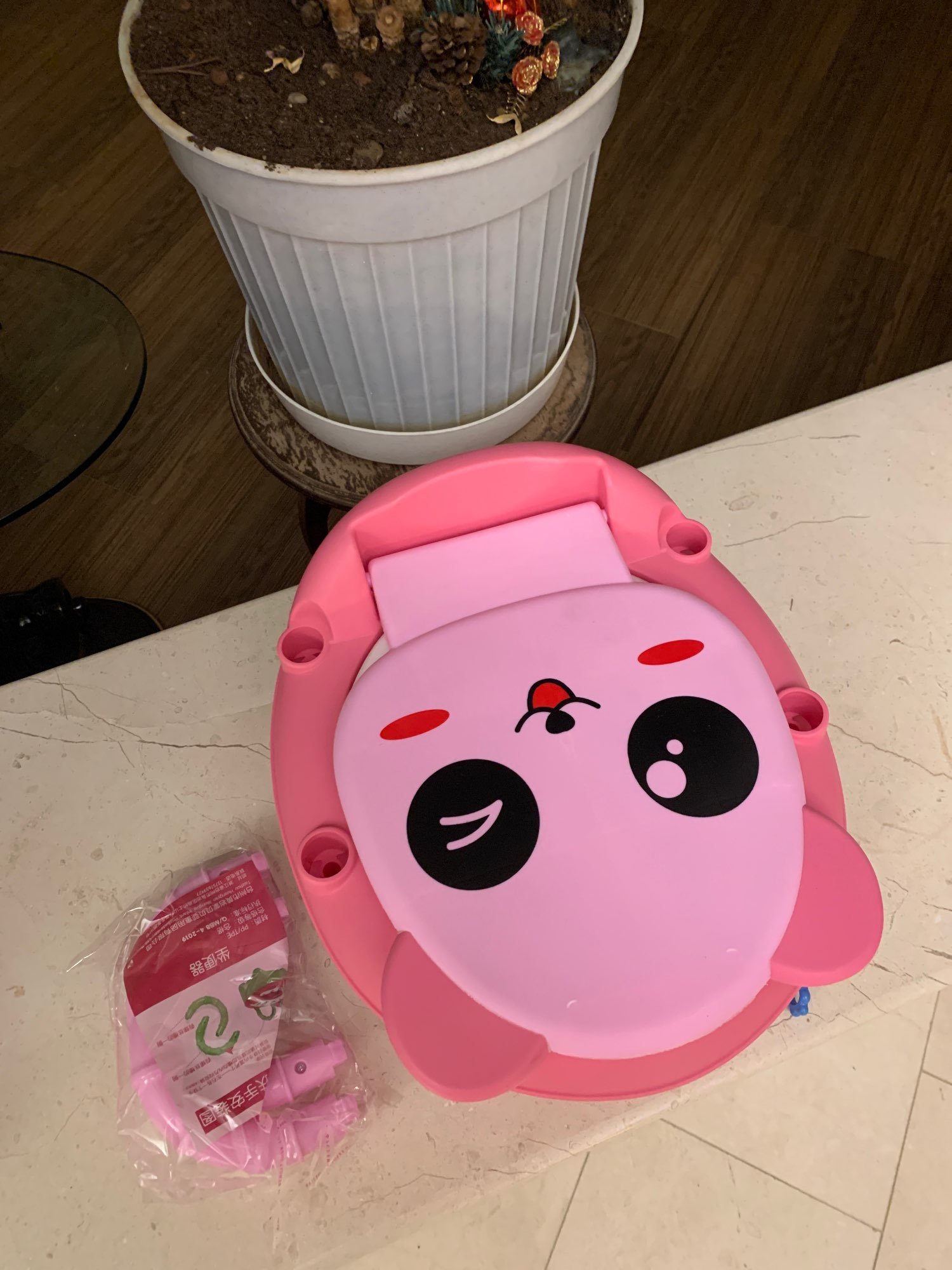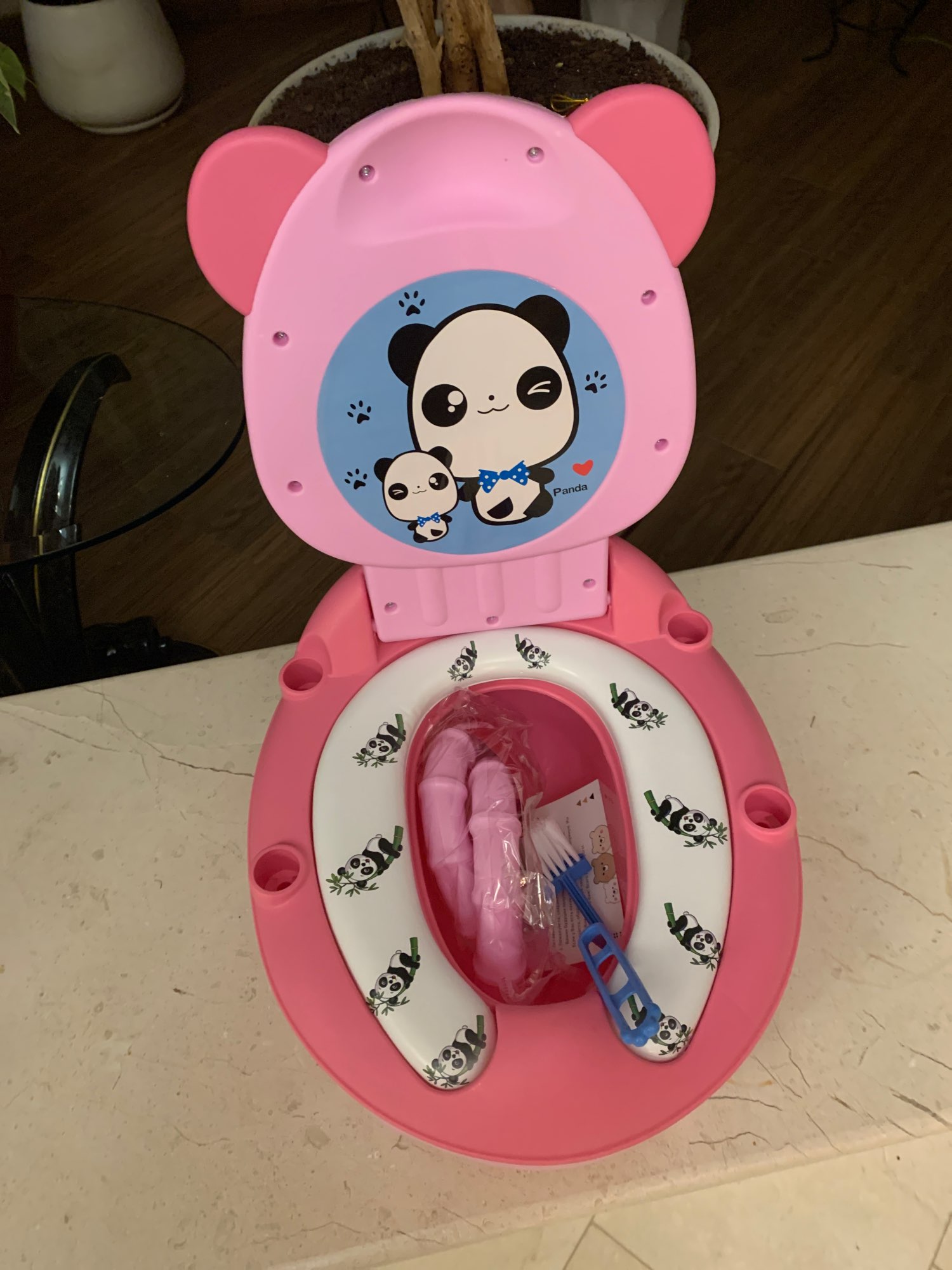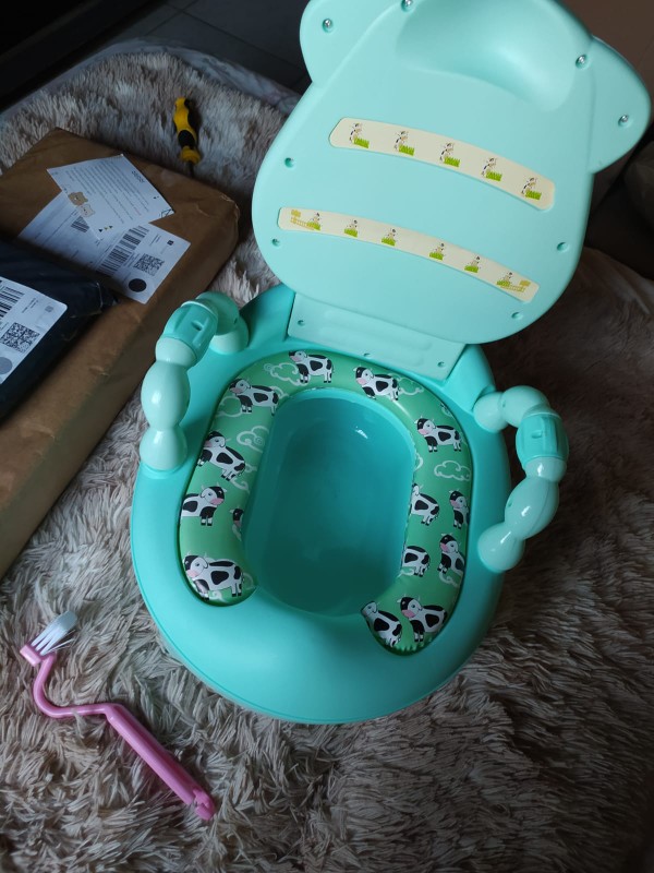 It came quickly, well packed. The whole thing. Cool potty, the child liked it. Hard plastic. Thanks to the overlay on the legs is very stable. The order is satisfied, I recommend to buy.