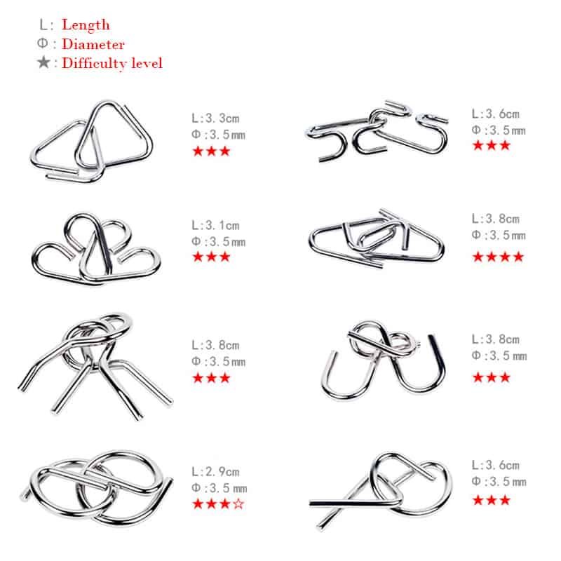 This metal puzzle set consists of 8 classic metal puzzles. All of these puzzles are very classic and popular, and they are very ideal for kids and adults.