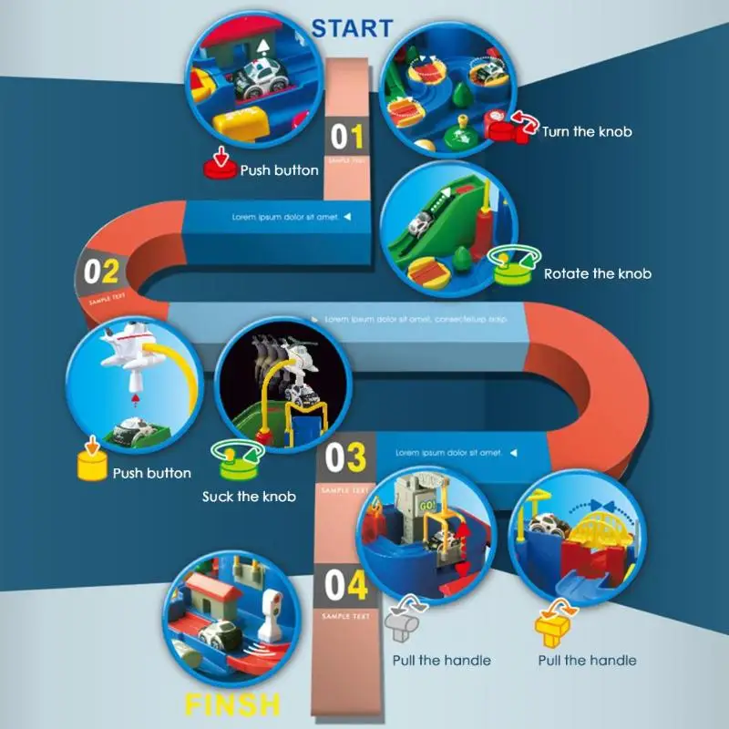 2. Reasonable mechanical structure, no battery, stable structure, convenient operation. Different from traditional toys, can not be accompanied, children must do it by themselves, let children enjoy the track toys.