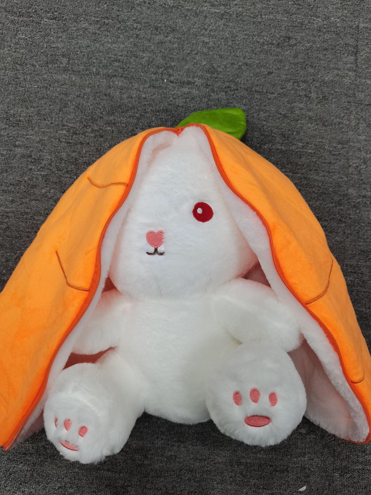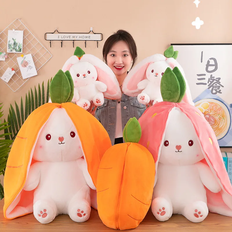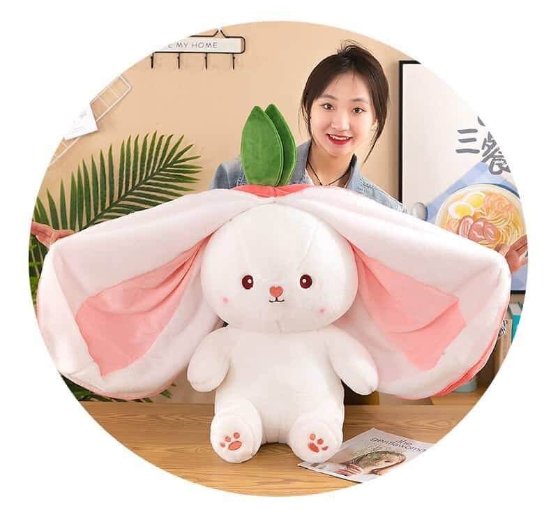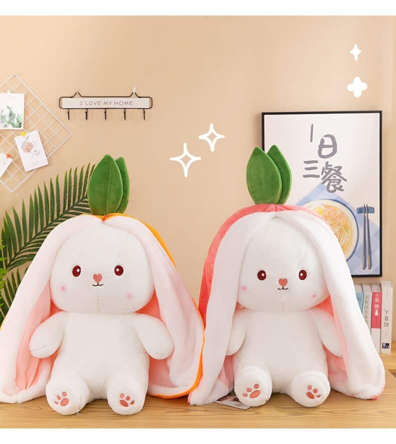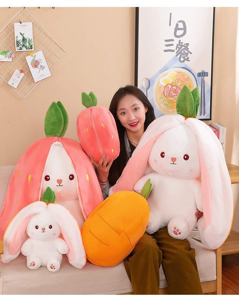 Unique Plush Shape: The unique appearance of the design can be a cute strawberry, carrot, or a cute rabbit. Pull on the rabbit ears and it becomes a cute strawberry or carrot, pull off the ears and it is a cute little rabbit. This makes it the equivalent of having two cute plush toys.