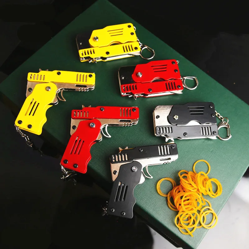 Foldable design: the Rubber Band Gun Keychain is designed with keychains that can be hung on the keys, belt, bag, schoolbag, or other things, and they are foldable, easy to carry and store, won’t take up much space, but can bring you more fun