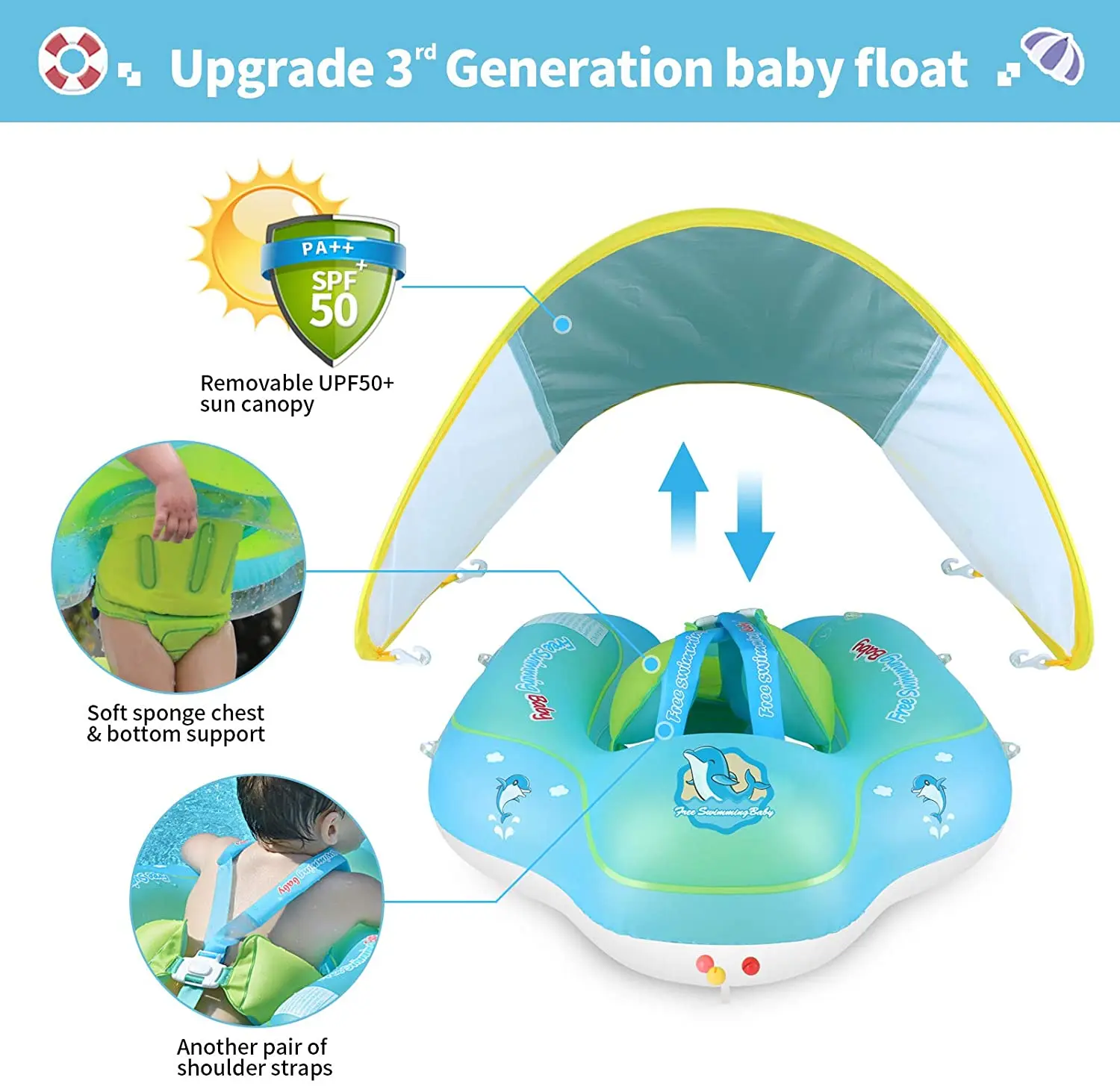 New Upgraded smart swim trainer is designed to help babies learn kick and swim in a horizontal position (Instead of vertical), removable canopy has mesh sides and offers UPF 50+ sun protection.