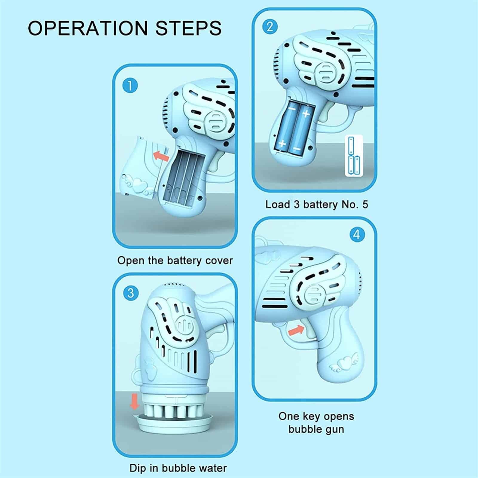 SAFECOOLING FAN MODE – The fan uses soft sponge rotor blades to provide safe bubble toys for your kids. When the child is tired of chasing, she will feel very hot. The bubble maker can be used as a small fan to provide cool and comfortable wind.