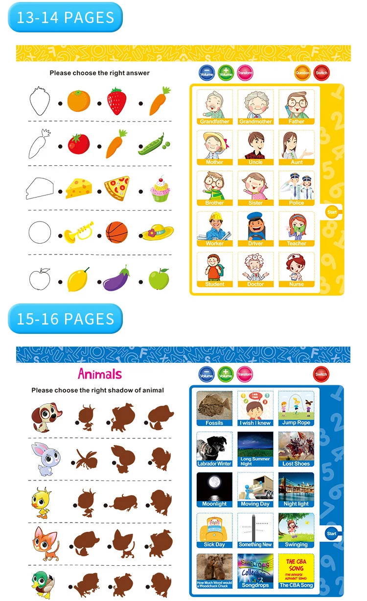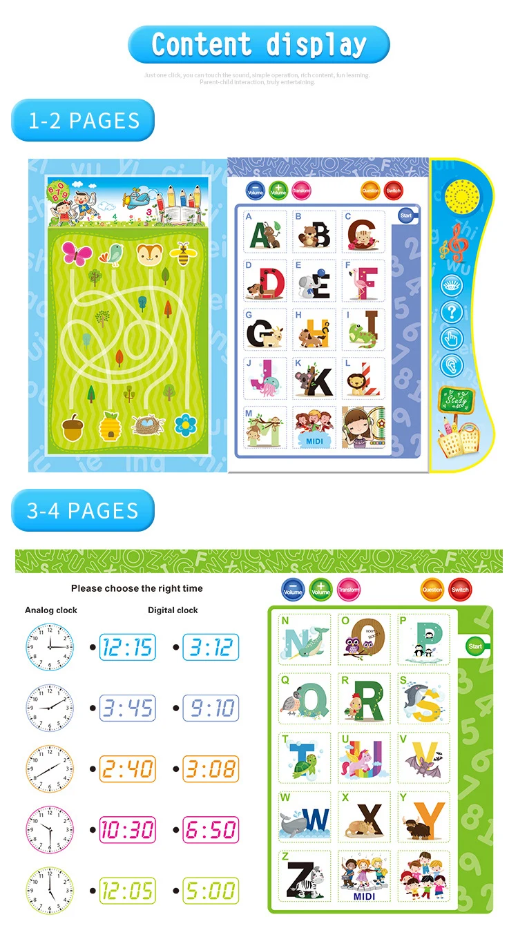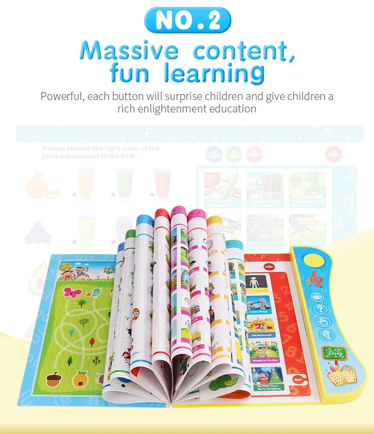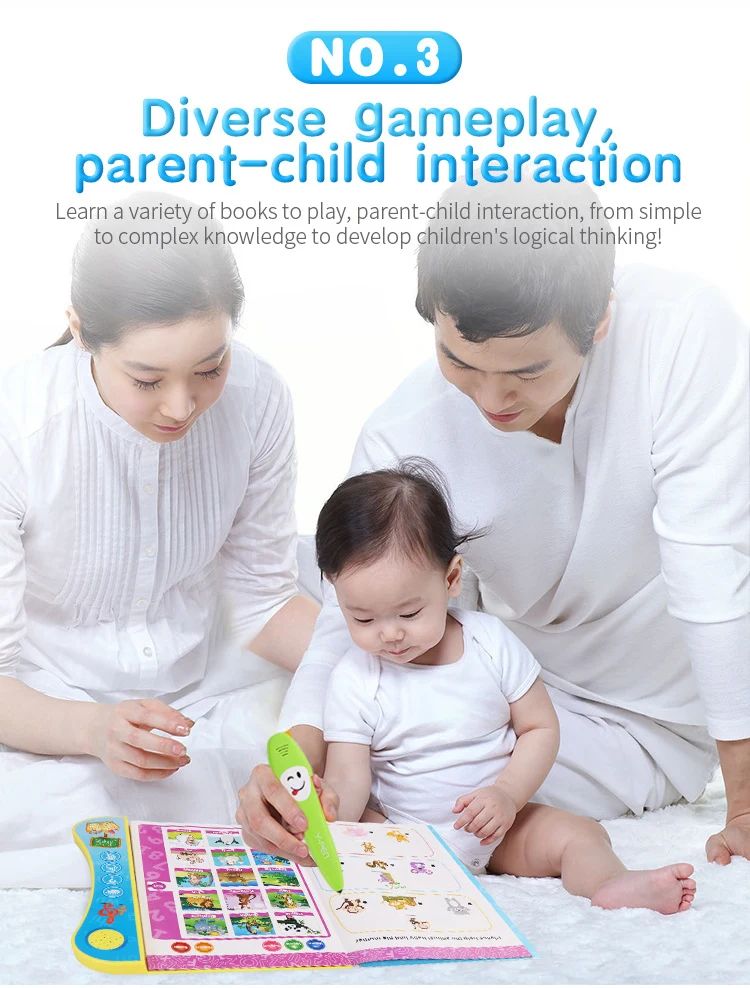 Talking Pen Book is an intelligent interactive toy consisting of multi-functions, which is specially tailored for early education. Your baby can not only enjoy many kinds of music and story but also learn a large number of common sense from animals to transportation, dramatically stimulating children’s learning ability. Each button will surprise children and give them a rich enlightenment education. The fuselage is made of ABS environmentally-friendly material, allowing children to have healthy playtime and parents rest assured. Vivid and interesting interactive interface, the best choice for children. Let’s own it to discover a new world with your kids and let the teaching goes together with pleasure!