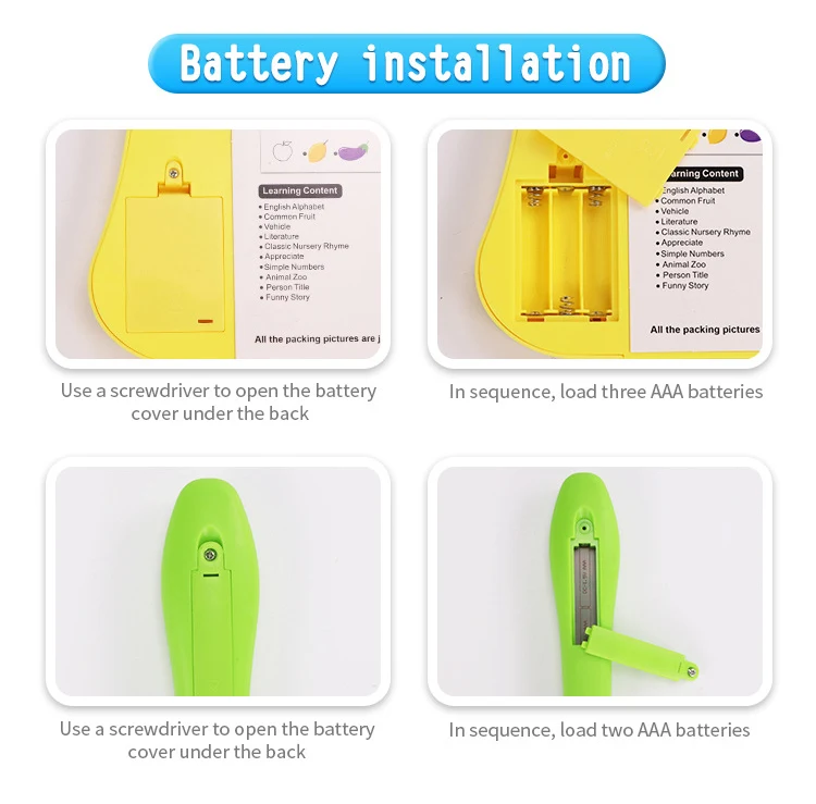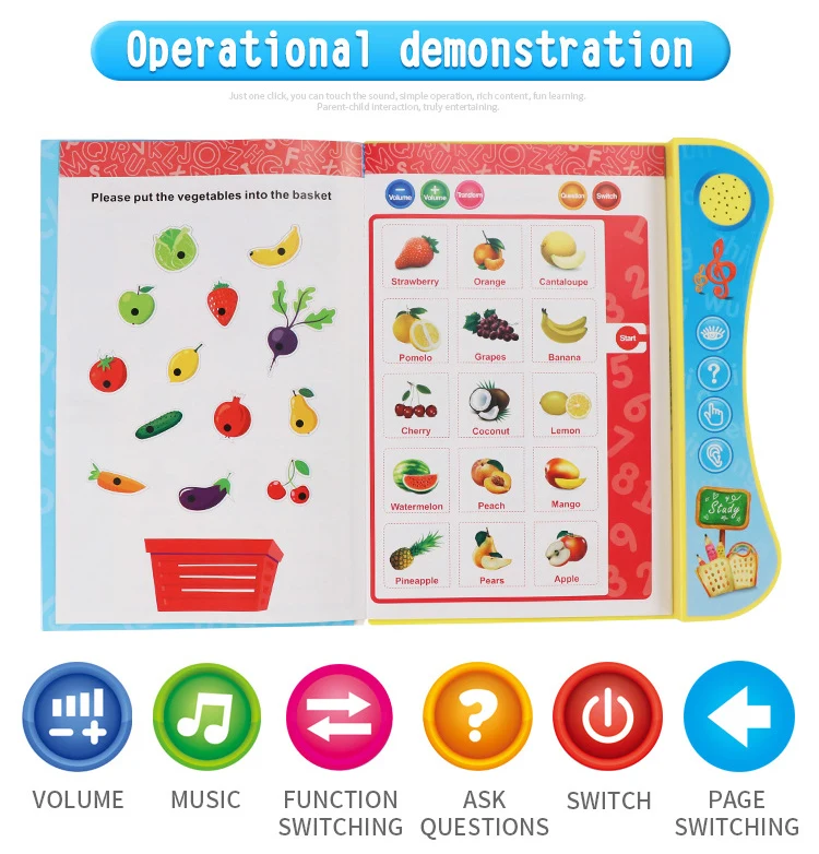 Talking Pen Book is an intelligent interactive toy consisting of multi-functions, which is specially tailored for early education. Your baby can not only enjoy many kinds of music and story but also learn a large number of common sense from animals to transportation, dramatically stimulating children’s learning ability. Each button will surprise children and give them a rich enlightenment education. The fuselage is made of ABS environmentally-friendly material, allowing children to have healthy playtime and parents rest assured. Vivid and interesting interactive interface, the best choice for children. Let’s own it to discover a new world with your kids and let the teaching goes together with pleasure!