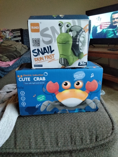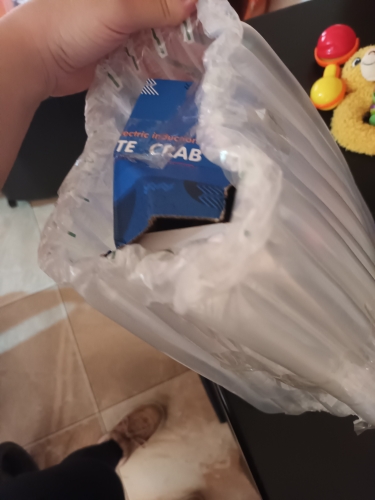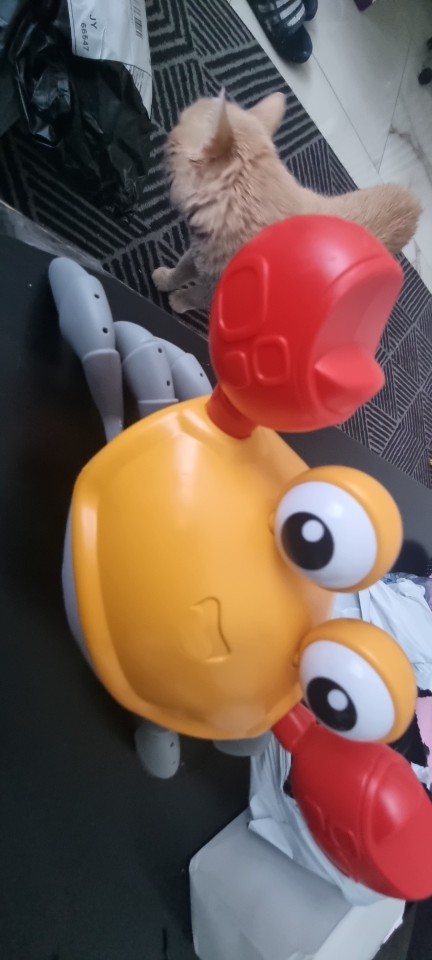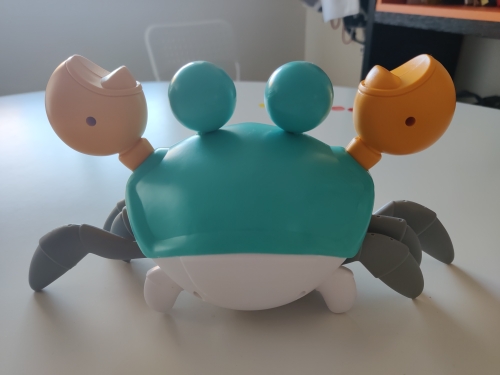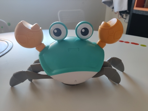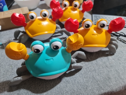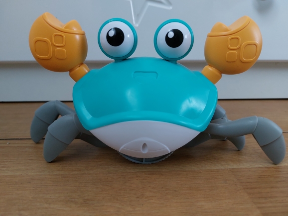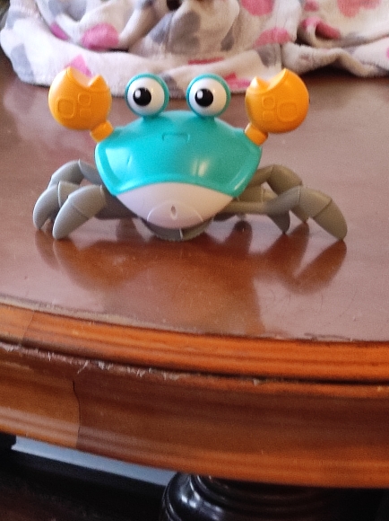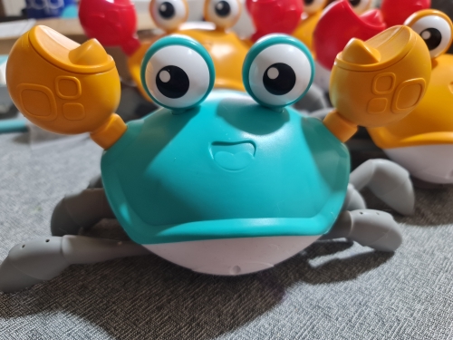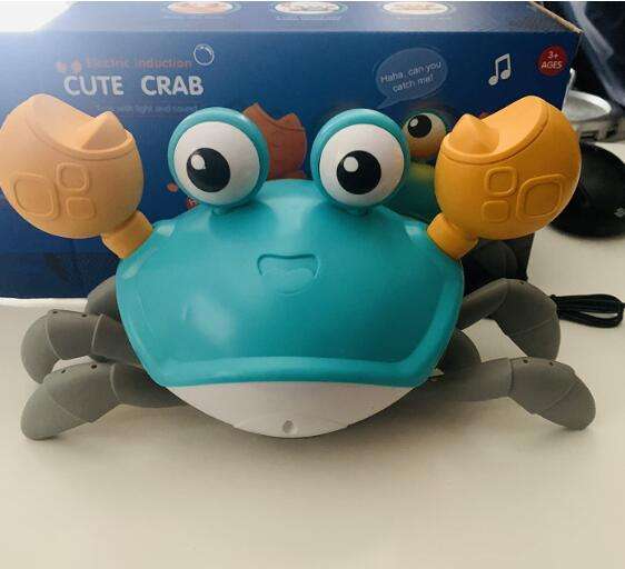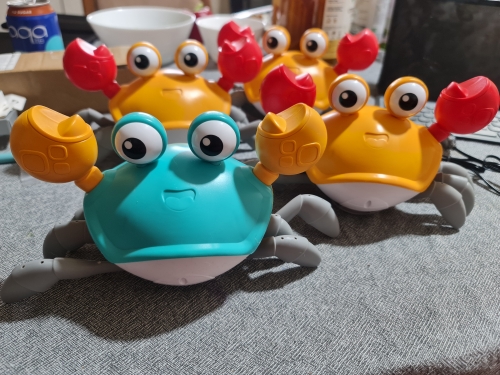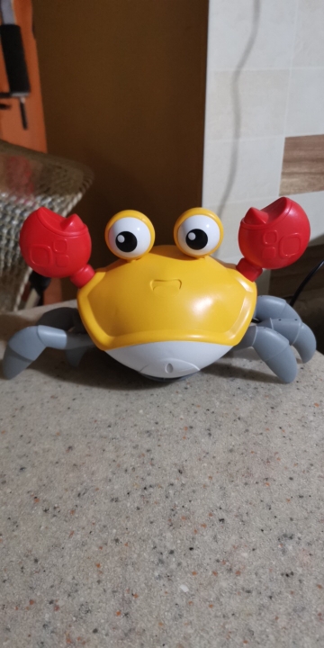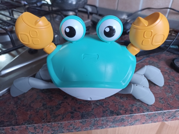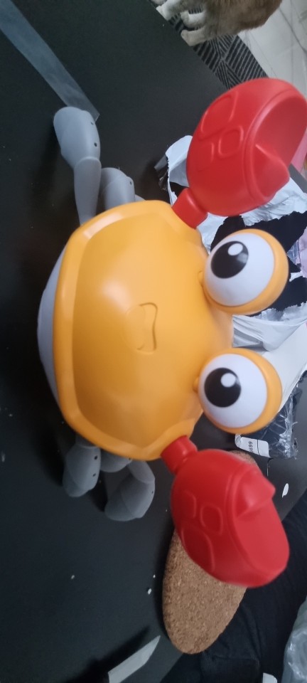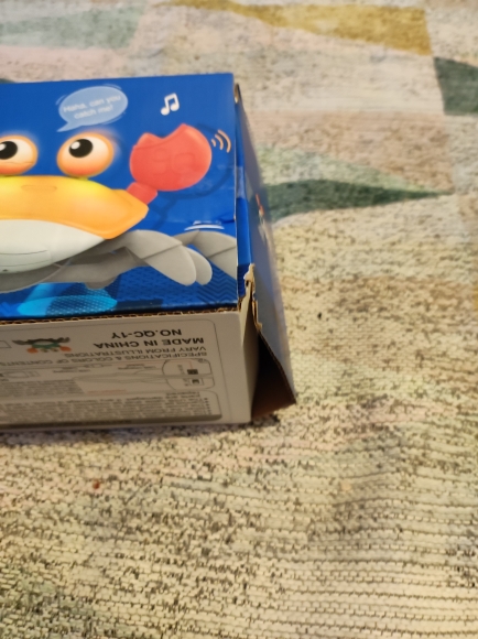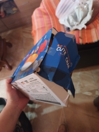 The box is a little crumpled during transportation, but the crab is intact, everything works. The toy is quite funny