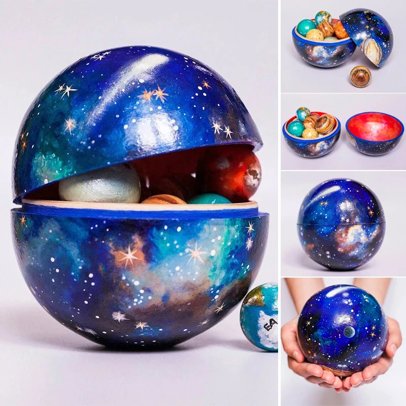 Astronomy is quite hard to study, but it is definitely important and exciting. With this hand-painted Wooden solar system cosmos learning game you will easily encourage your baby to explore the universe. All planets have signs, so everyone can easily identify them. It helps to learn planet properly. The planet has many small, but important features that make it a fantastic gift to all-aged kids and even for adults. It is a unique addition to the collection of advanced space lovers and a good start for interested ones. This solar system is safe for kids because it is used only lead-free paint and peeled linden wood. What are you looking for? Buy now!